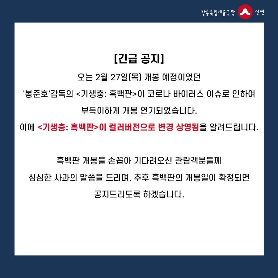 오는 2월 27일(목) 개봉 예정이었던 '봉준호'감독의 <기생충: 흑백판>이 코로나 바이러스 이슈로 인하여 부득이하게 개봉이 연기되었습니다. 이에 <기생충: 흑백판>이 컬러버전으로 변경 상영됨을 알려드립니다.