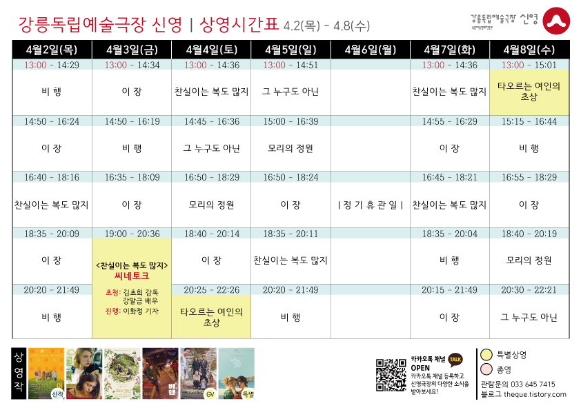 | [04.09 - 04.15] 상영 시간표 (0) | 2020.04.05 |