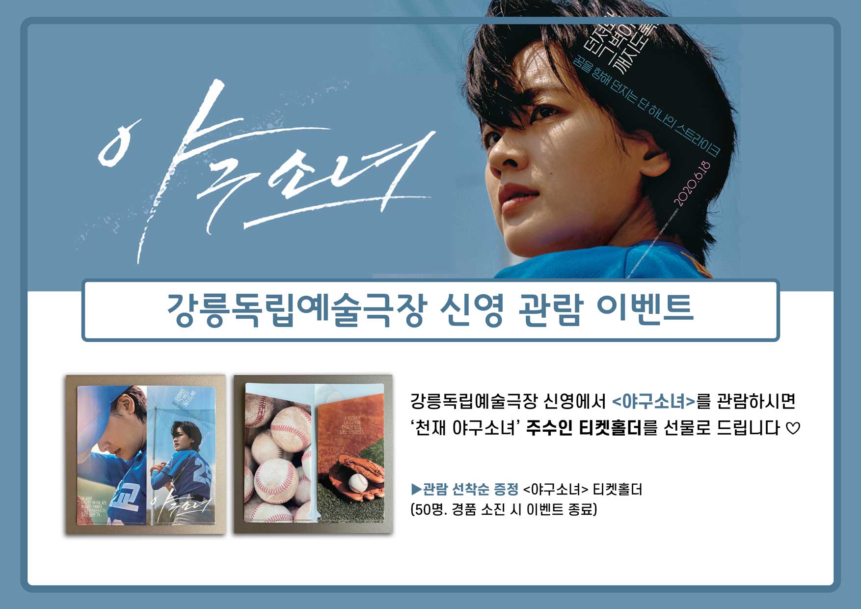 강릉독립예술극장 신영에서 <야구소녀>를 관람하시면 '천재 야구소녀' 주수인 티켓홀더를 선물로 드립니다♡