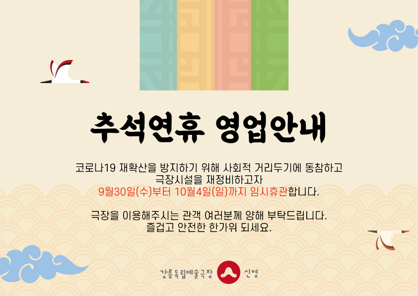 9월30일(수)부터 10월4일(일)까지 임시휴관합니다.