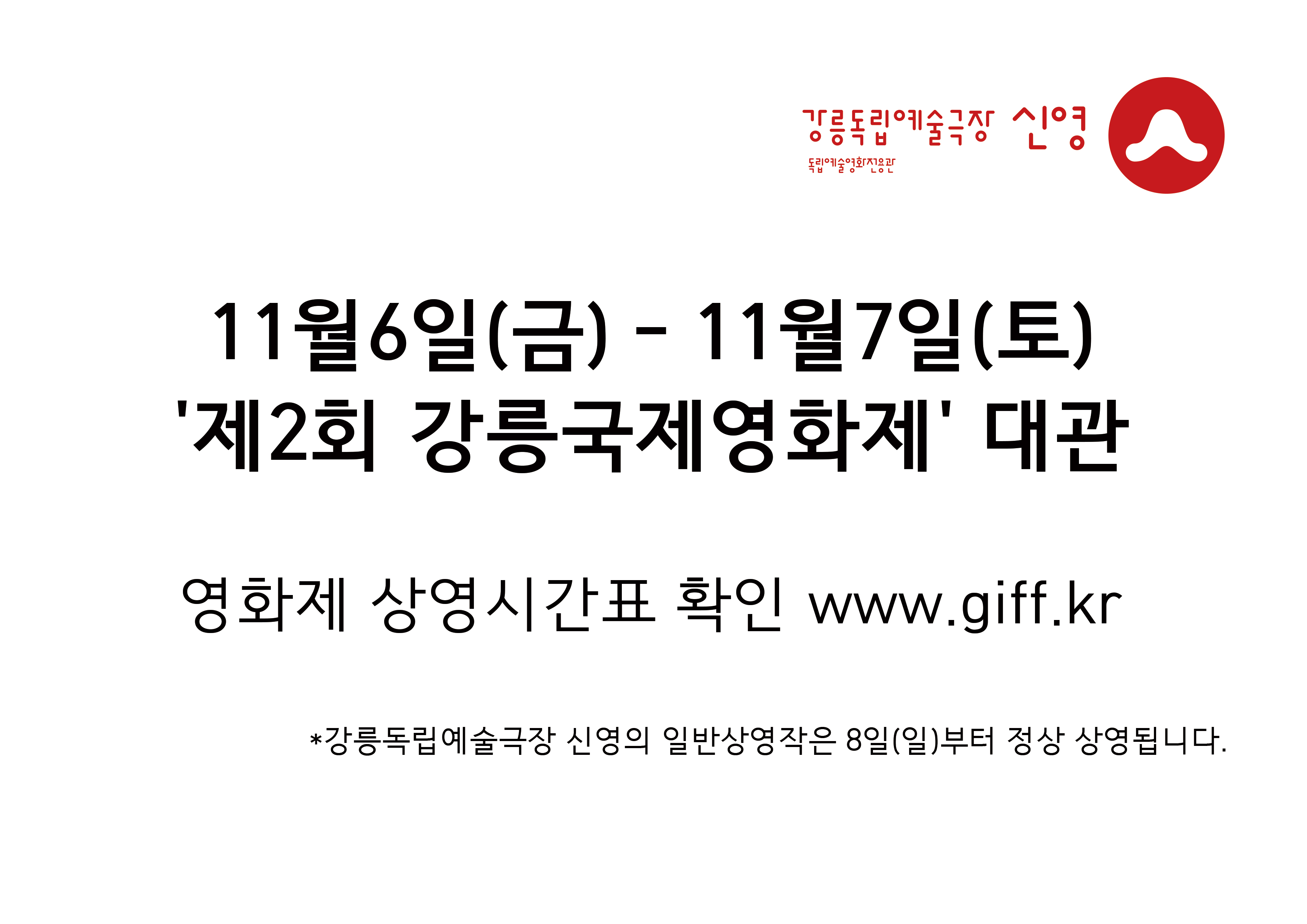 📢11월6일(금)부터 11월7일(토)까지 '제2회 강릉국제영화제' 대관 행사로 신영의 일반상영작은 잠시 쉬어갑니다.