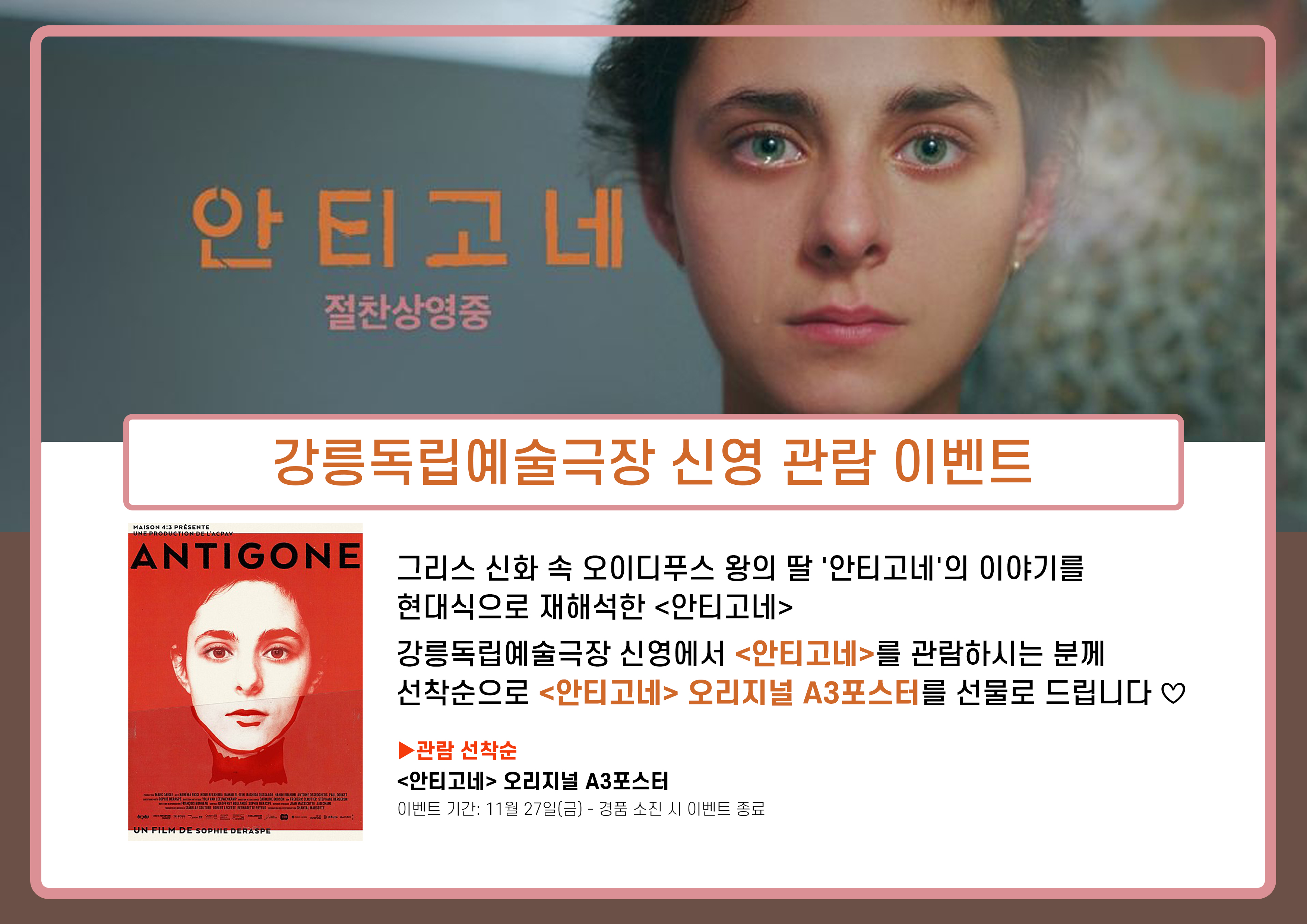 강릉독립예술극장 신영에서 <안티고네>를 관람하시는 분께 선착순으로 <안티고네> 오리지널 A3포스터를 선물로 드립니다♡