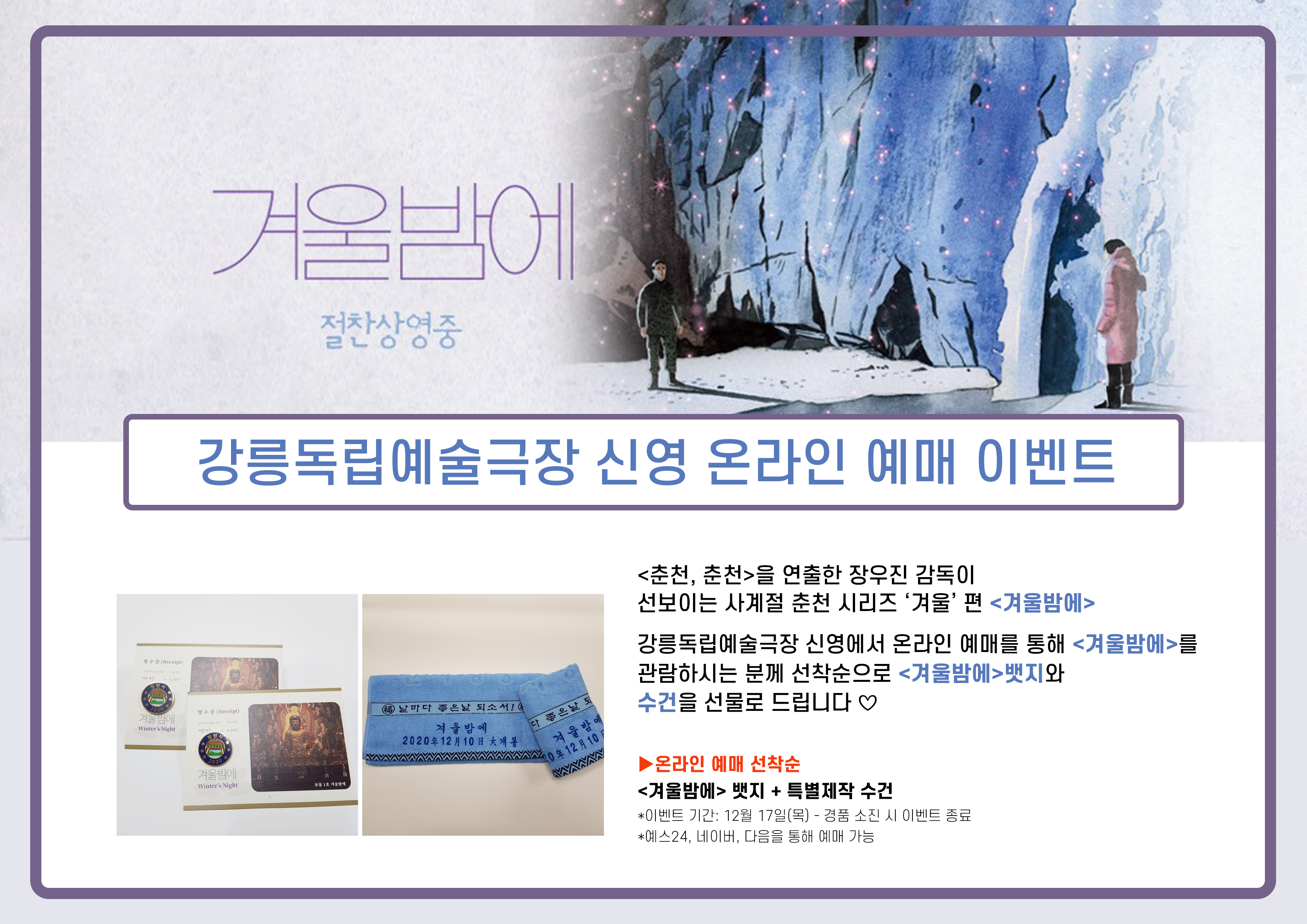 강릉독립예술극장 신영에서 온라인 예매를 통해 <겨울밤에>를 관람하시는 분께 선착순으로 <겨울밤에> 뱃지와 수건을 선물로 드립니다 ♡