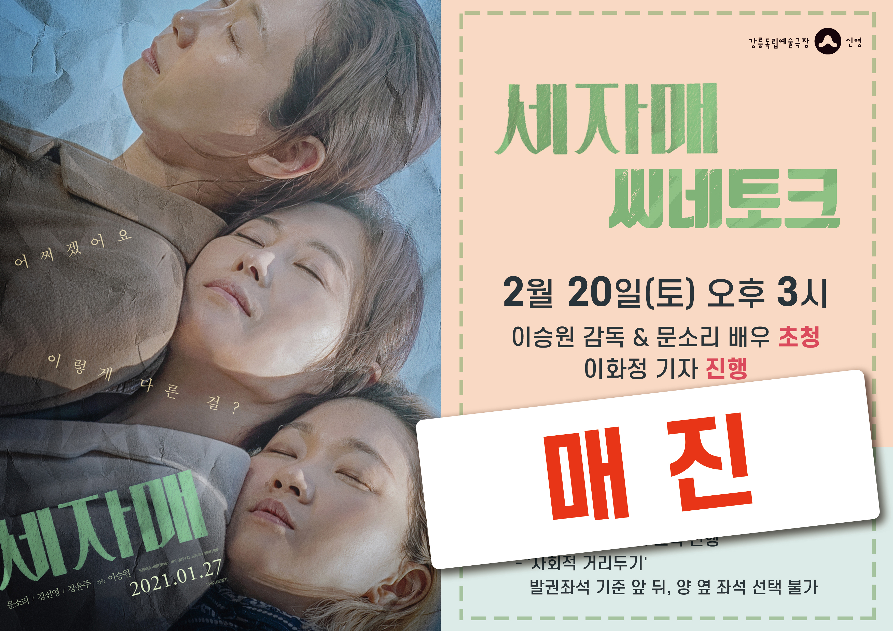 ※ 본 상영 회차가 매진된 관계로 이전에 관람하신 <세자매> 티켓을 지참하셔도 씨네토크에는 입장하실 수 없음을 미리 알려드립니다. 더불어 안전을 위하여 티켓의 추가 판매 또한 이루어지지 않을 예정이오니 참고 바랍니다.