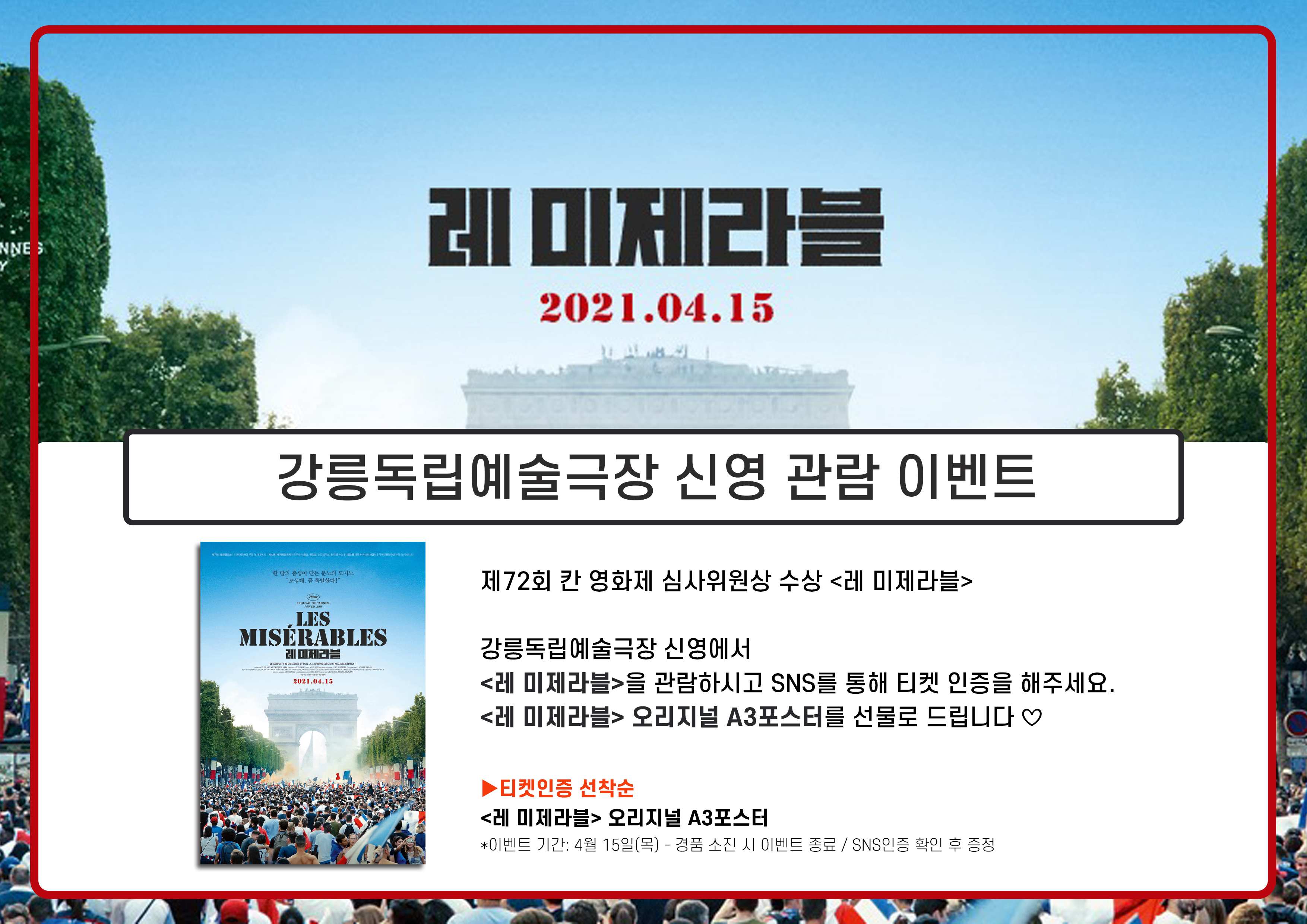 강릉독립예술극장 신영에서 <레 미제라블>을 관람하시고 SNS를 통해 티켓 인증을 해주세요.