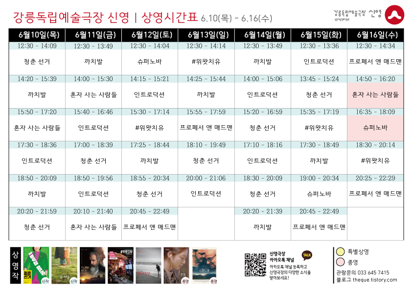 이번 주는 1회차 상영 시작 시간이 12:30분입니다. 관람 시 참고 바랍니다.