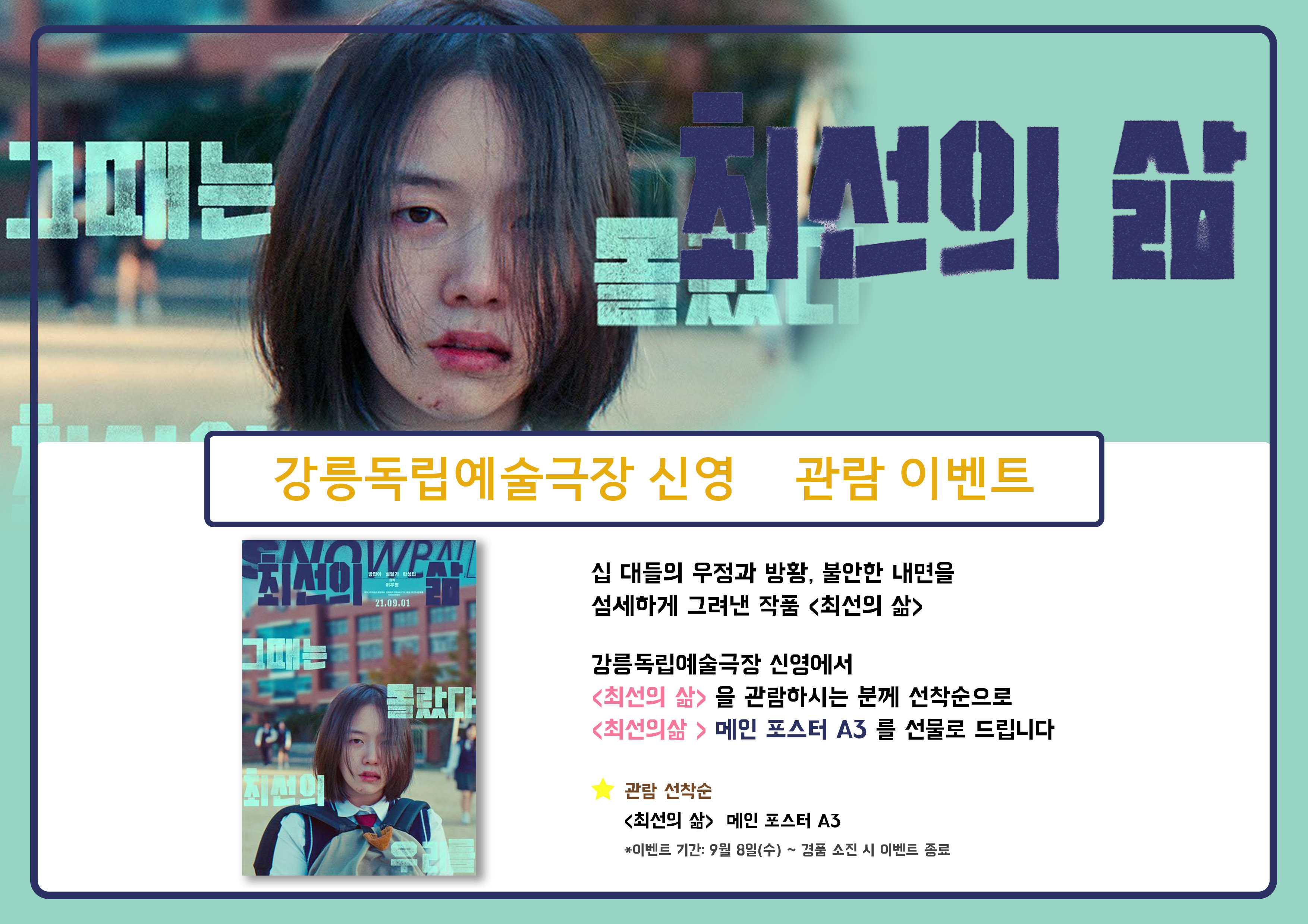 강릉독립예술극장 신영에서 <최선의 삶>을 관람하시는 분께 선착순으로