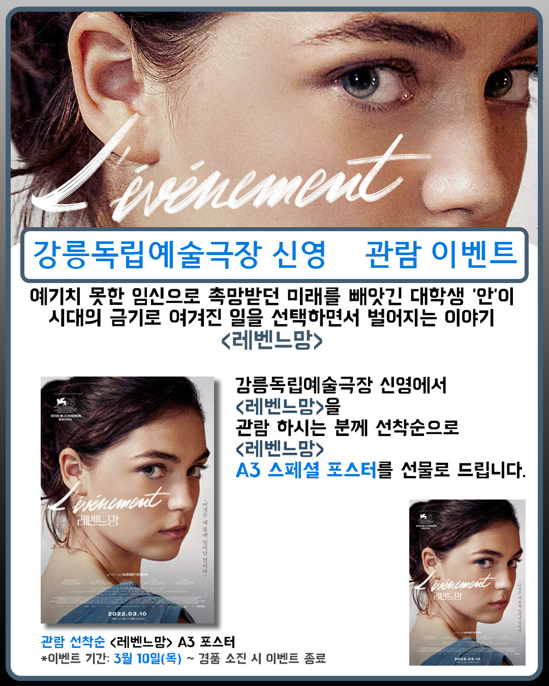 강릉독립예술극장 신영에서 <레벤느망>를 관람하시는 분께 선착순으로 <레벤느망> 한정판 A3 포스터를 선물로 드립니다.😆