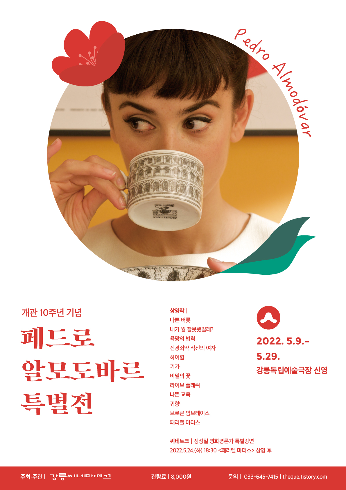 스페인을 대표하는 영화감독 페드로 알모도바르의 작품 12편을 상영합니다. 초기 장편 연출작인 1983년 <나쁜 버릇>을 시작으로 2000년대를 대표하는 <귀향>과 <브로큰 임브레이스>, 여성과 역사의식을 이어내 호평을 받은 <패러렐 마더스>까지. 강렬한 색채를 통해 인간의 욕망을 탐구해 온 알모도바르 감독의 영화들을 스크린으로 만나볼 수 있습니다. 더불어 이번 특별전에는 <패러렐 마더스> 상영과 함께 정성일 영화평론가의 특별 강연을 준비했습니다. 이번 개관 10주년 특별전을 통해 알모도바르 감독의 세계를 충분히 경험할 수 있는 시간이 되길 바랍니다.