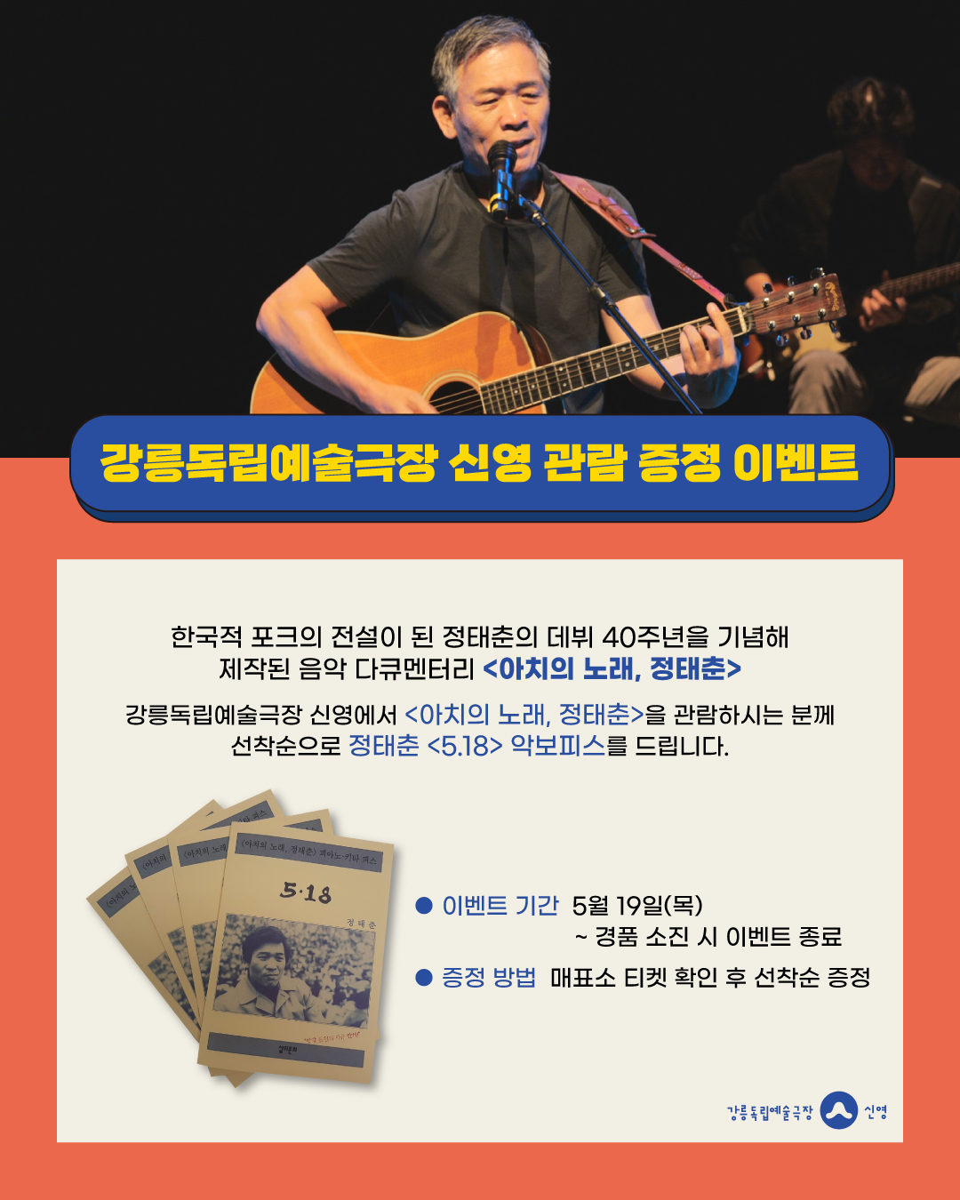 강릉독립예술극장 신영에서 <아치의 노래, 정태춘>을 관람하시는 분께 선착순으로 정태춘 <5.18> 악보피스를 드립니다.