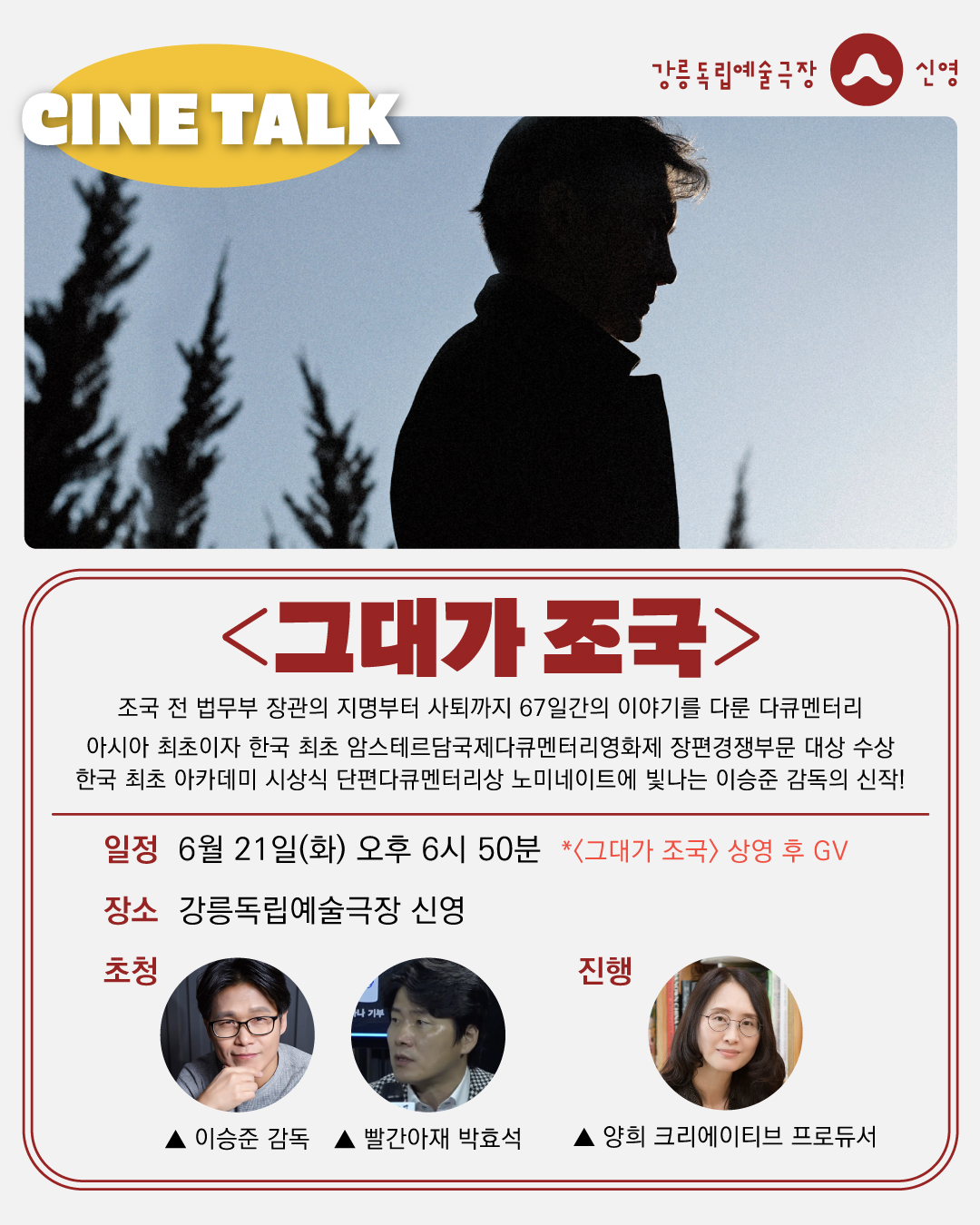 6월 21일 화요일 강릉독립예술극장 신영에서 <그대가 조국>을 연출한 이승준 감독과 유튜버 빨간아재 그리고 양희 프로듀서를 만나보세요!