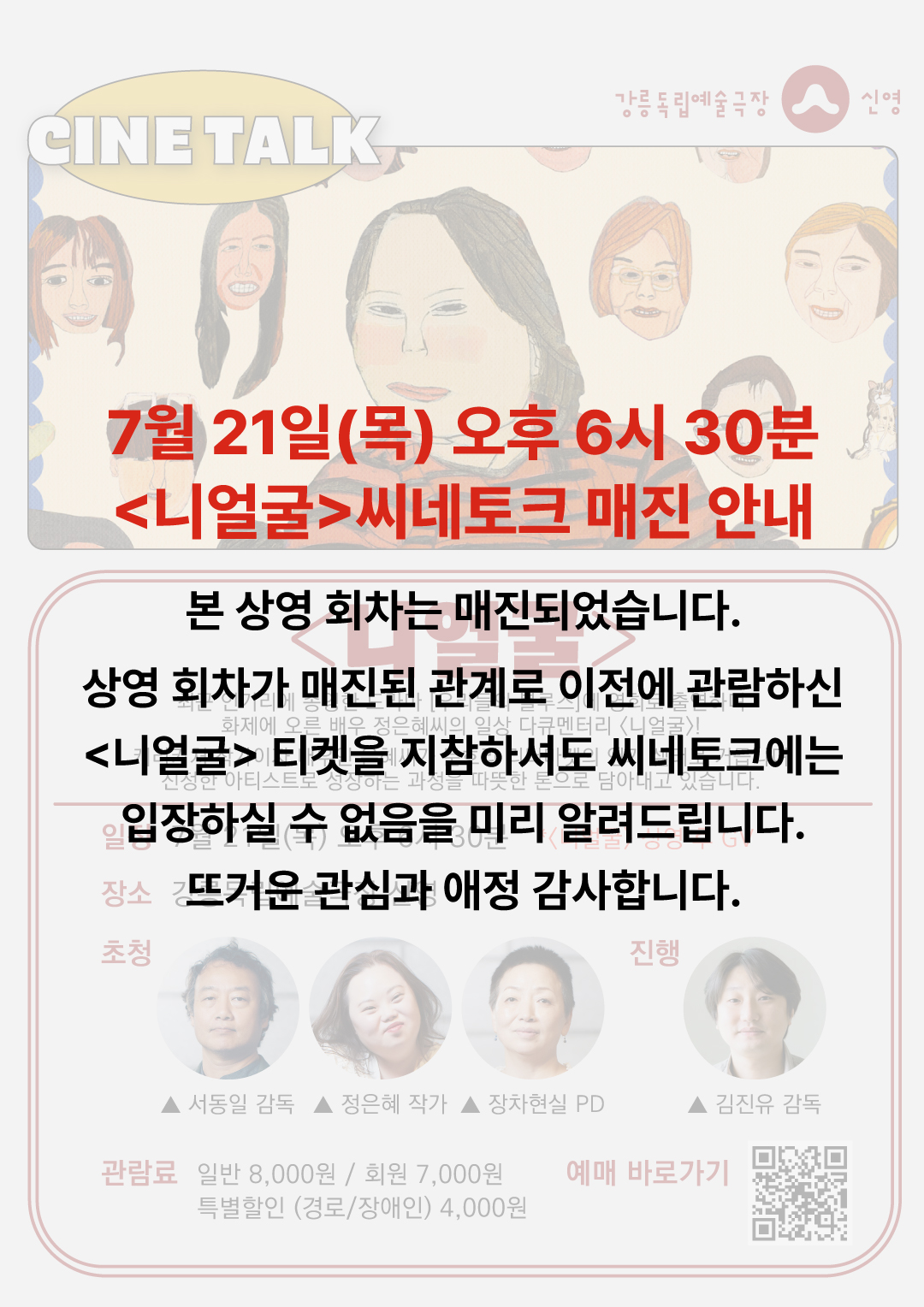 7월 21일(목) 오후 6시 30분 <니얼굴> 씨네토크 매진 안내