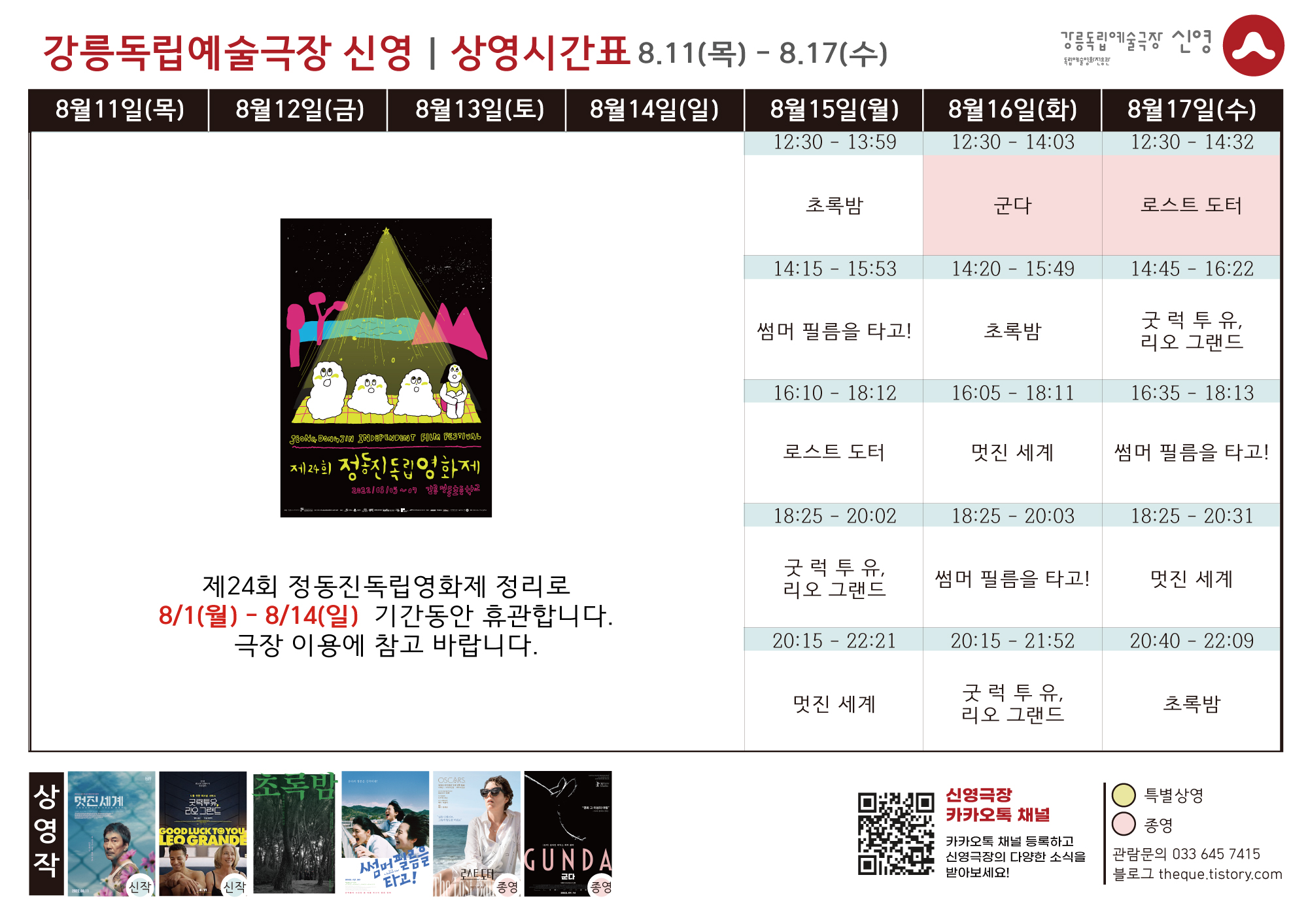 ※ 제24회 정동진독립영화제 준비 및 정리로 8/1(월) - 8/14(일) 기간동안 휴관합니다. 극장 이용에 참고 바랍니다.