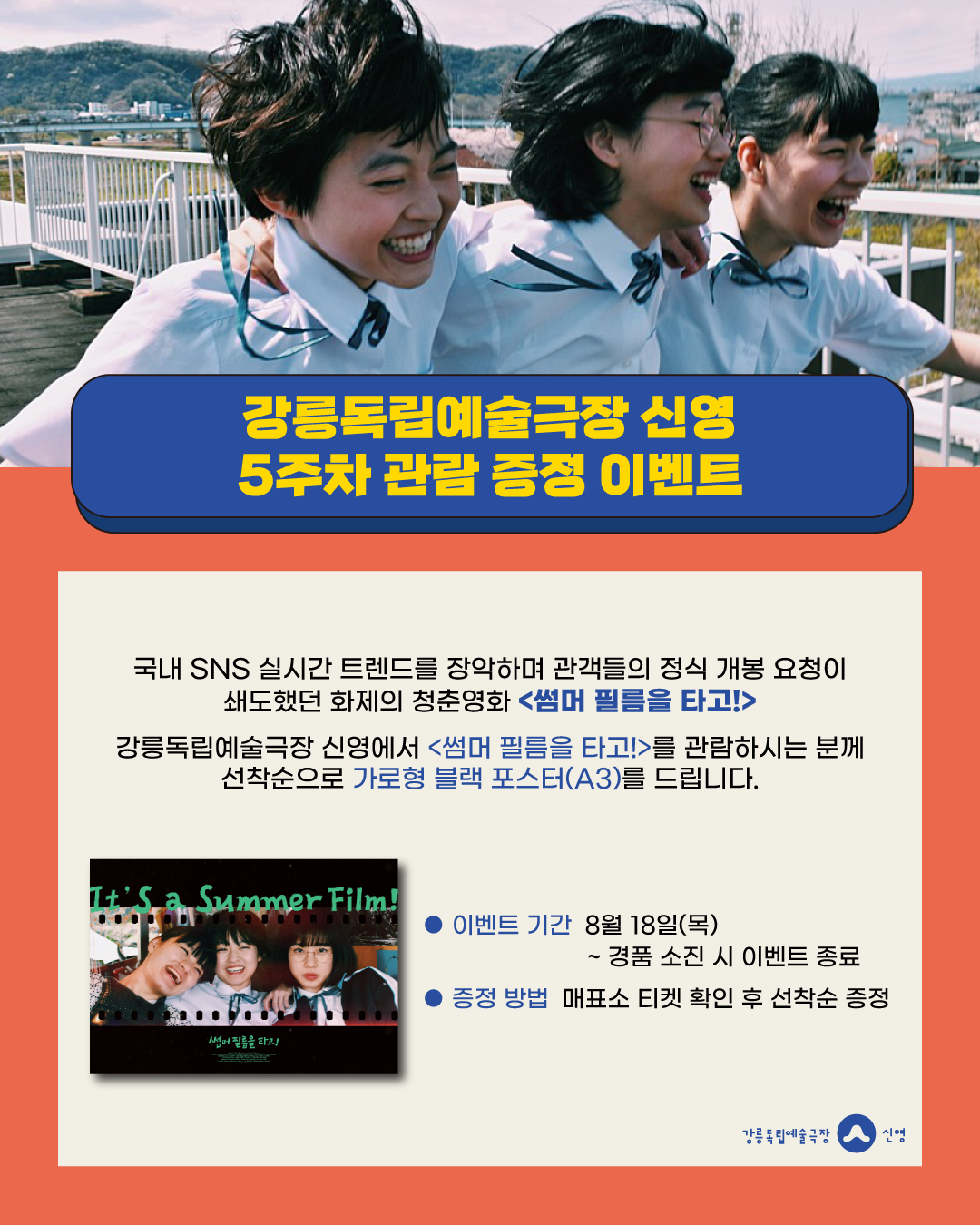 강릉독립예술극장 신영에서 <썸머 필름을 타고!>를 관람하시는 분께 선착순으로 가로형 블랙 포스터(A3)를 드립니다.