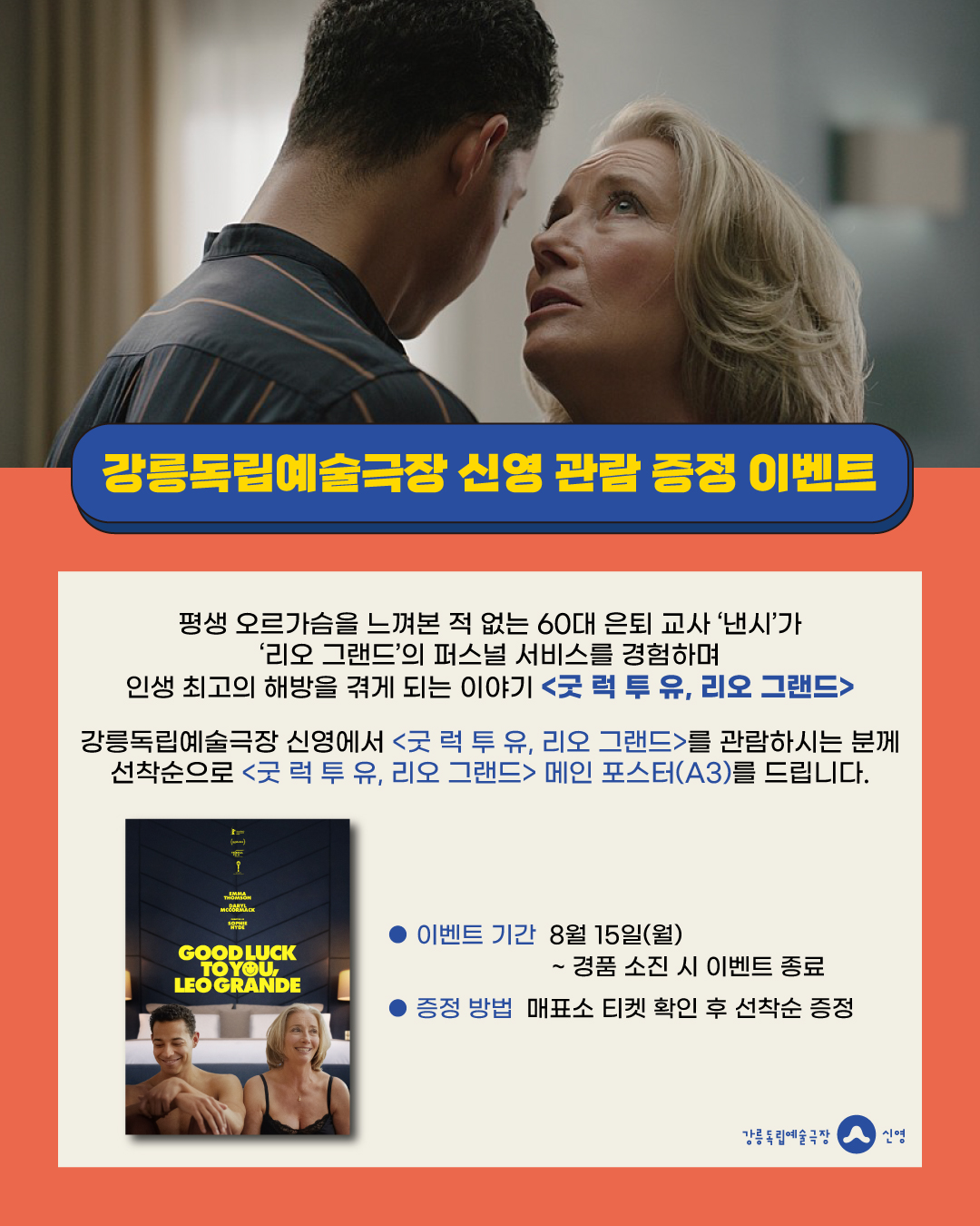 강릉독립예술극장 신영에서 <굿 럭 투 유, 리오 그랜드>를 관람하시는 분께 선착순으로 <굿 럭 투 유, 리오 그랜드> 메인 포스터(A3)를 드립니다.