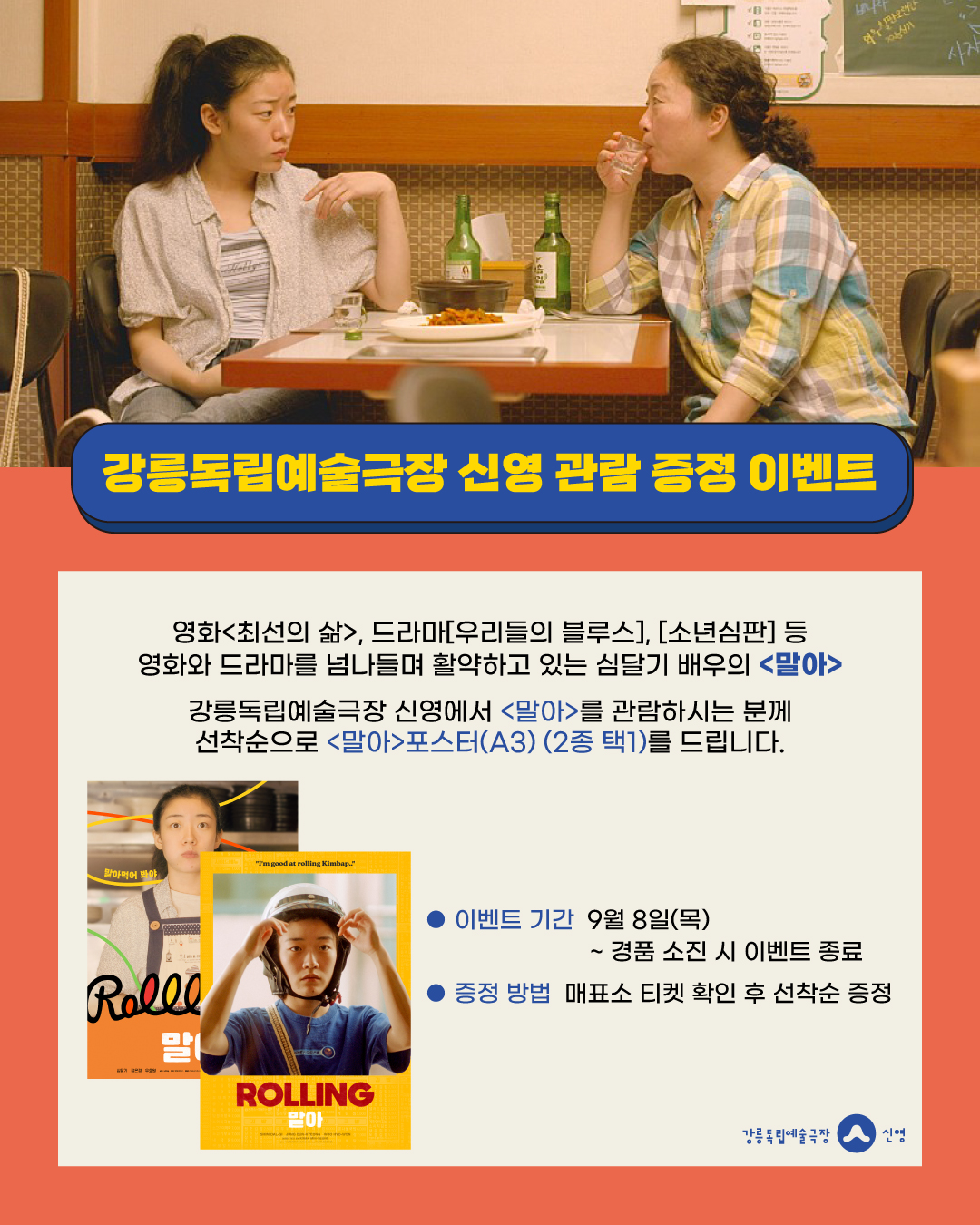 강릉독립예술극장 신영에서 <말아>를 관람하시는 분께 선착순으로 <말아> 포스터(A3) (2종 택1)를 드립니다.