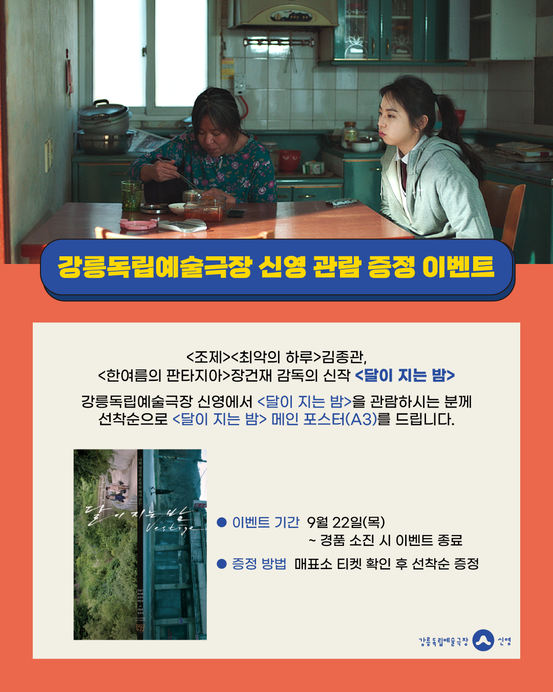강릉독립예술극장 신영에서 <달이 지는 밤>을 관람하시는 분께 선착순으로 <달이 지는 밤> 메인 포스터(A3)를 드립니다.