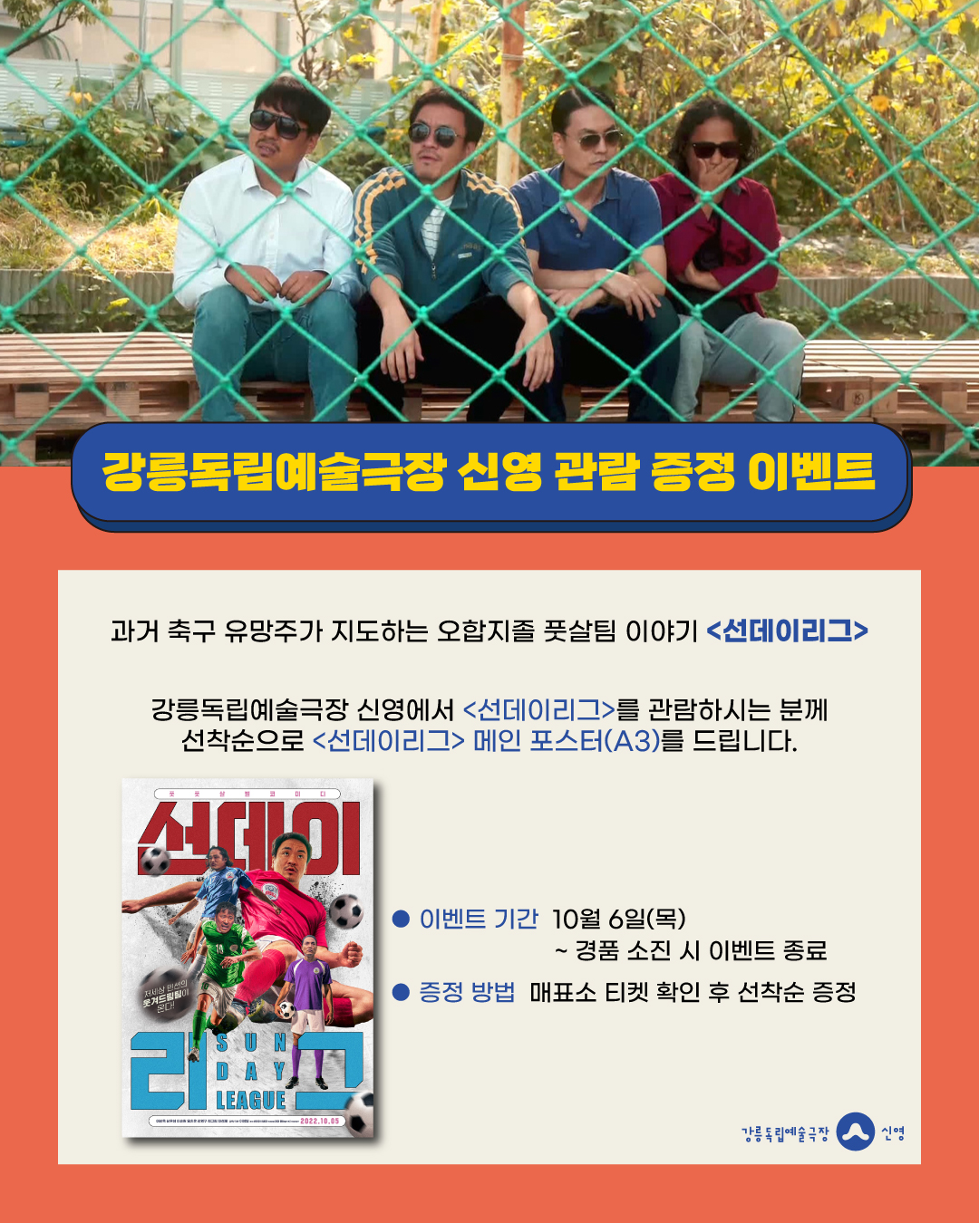 강릉독립예술극장 신영에서 <선데이리그>를 관람하시는 분께 선착순으로 <선데이리그> 메인 포스터(A3)를 드립니다.