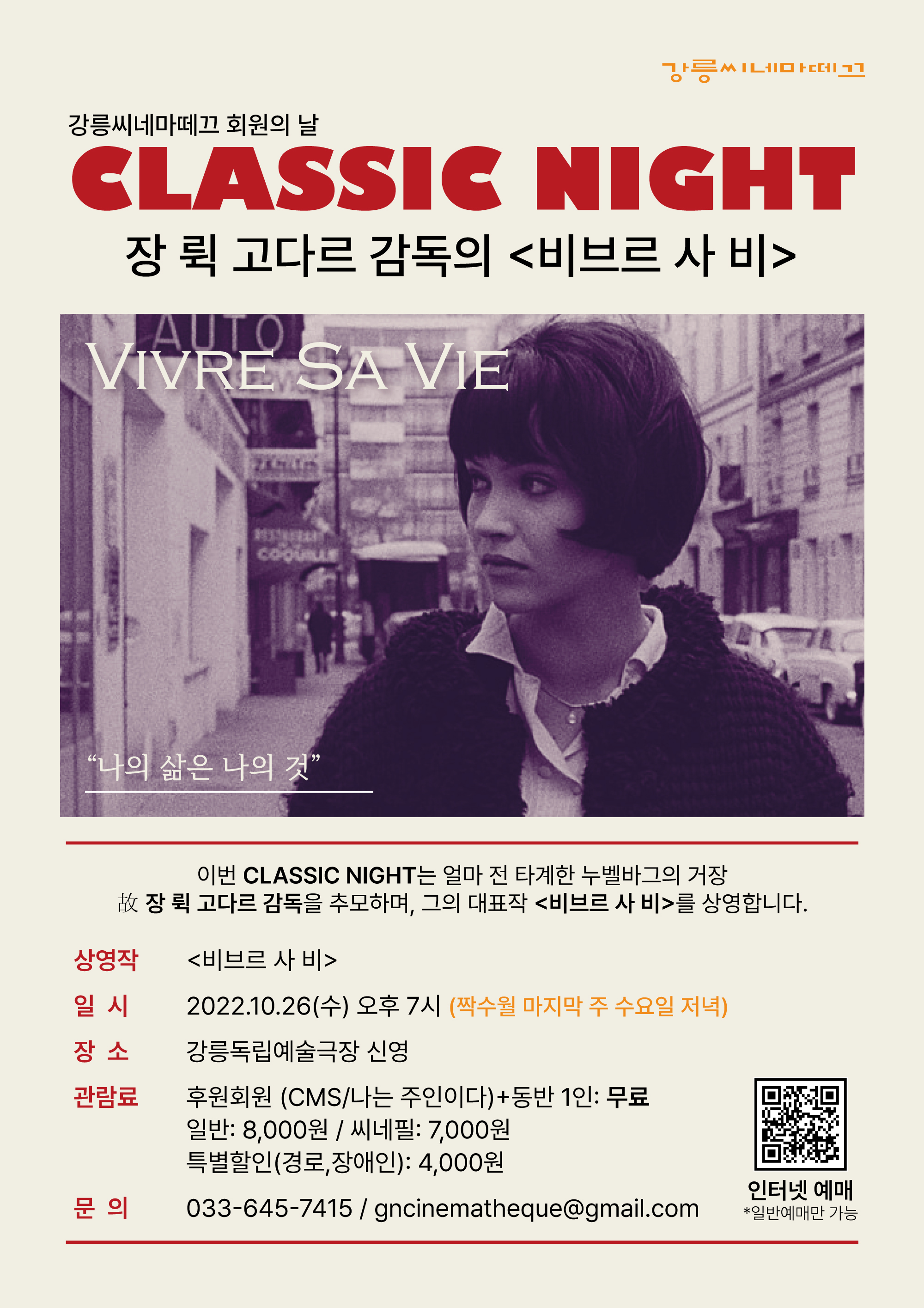 이번 CLASSIC NIGHT는 얼마 전 타계한 누벨바그의 거장 故 장 뤽 고다르 감독을 추모하며, 그의 대표작 <비브르 사 비>를 상영합니다.