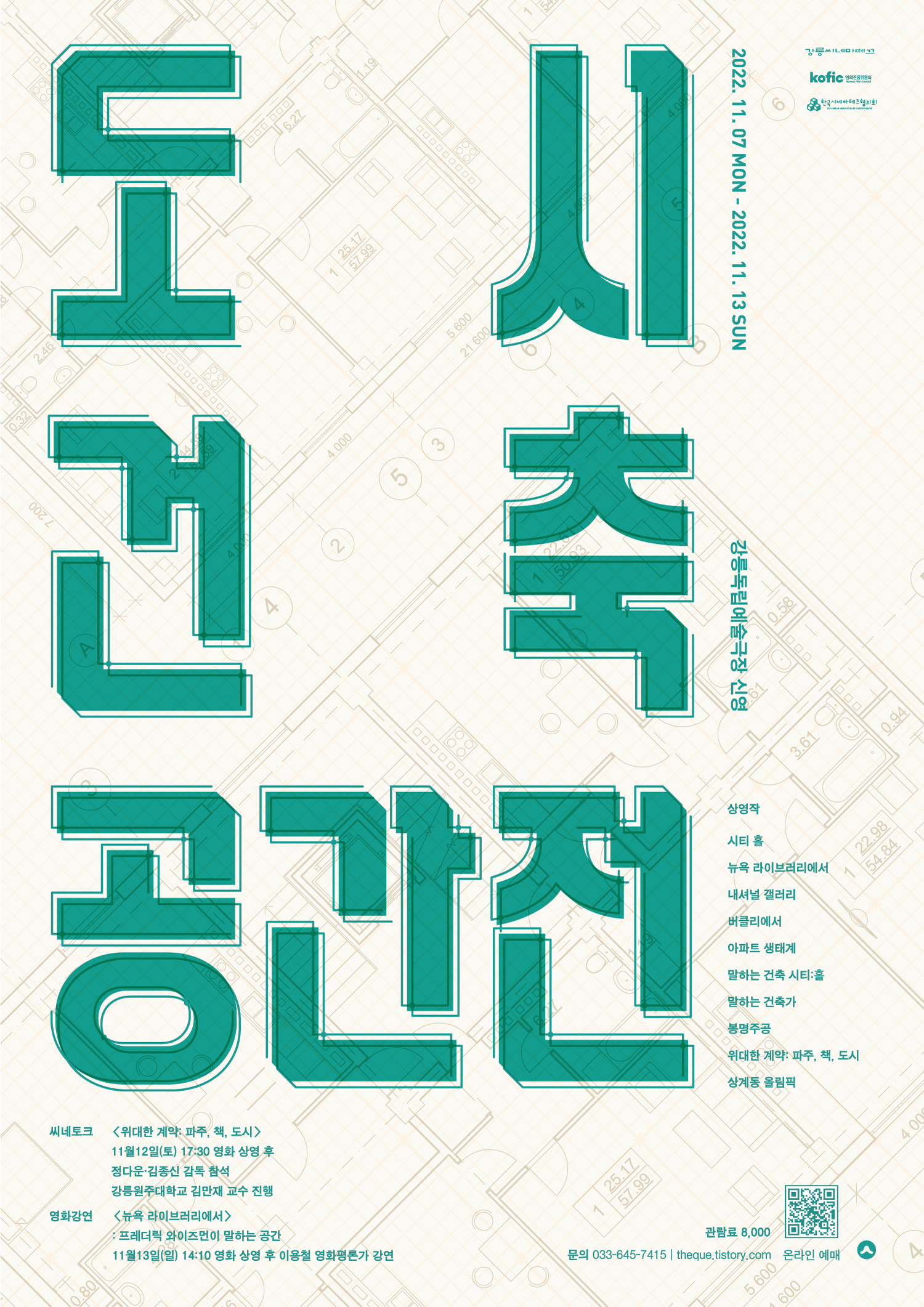 도시와 떼어놓을 수 없는 공공의 공간을 세심하게 지켜보는 프레더릭 와이즈먼 감독의 영화 4편, 건축 시리즈로 공공의 개념을 돌이켜 생각하게 만드는 정재은 감독의 영화 3편, 파주 출판도시 이야기 <위대한 계약: 파주, 책, 도시>, 재개발을 앞둔 아파트를 생태적 관점을 통해 돌아보는 <봉명주공>, 88서울올림픽을 앞두고 재개발로 살 곳을 잃은 주민들의 이야기 <상계동 올림픽>을 상영합니다.