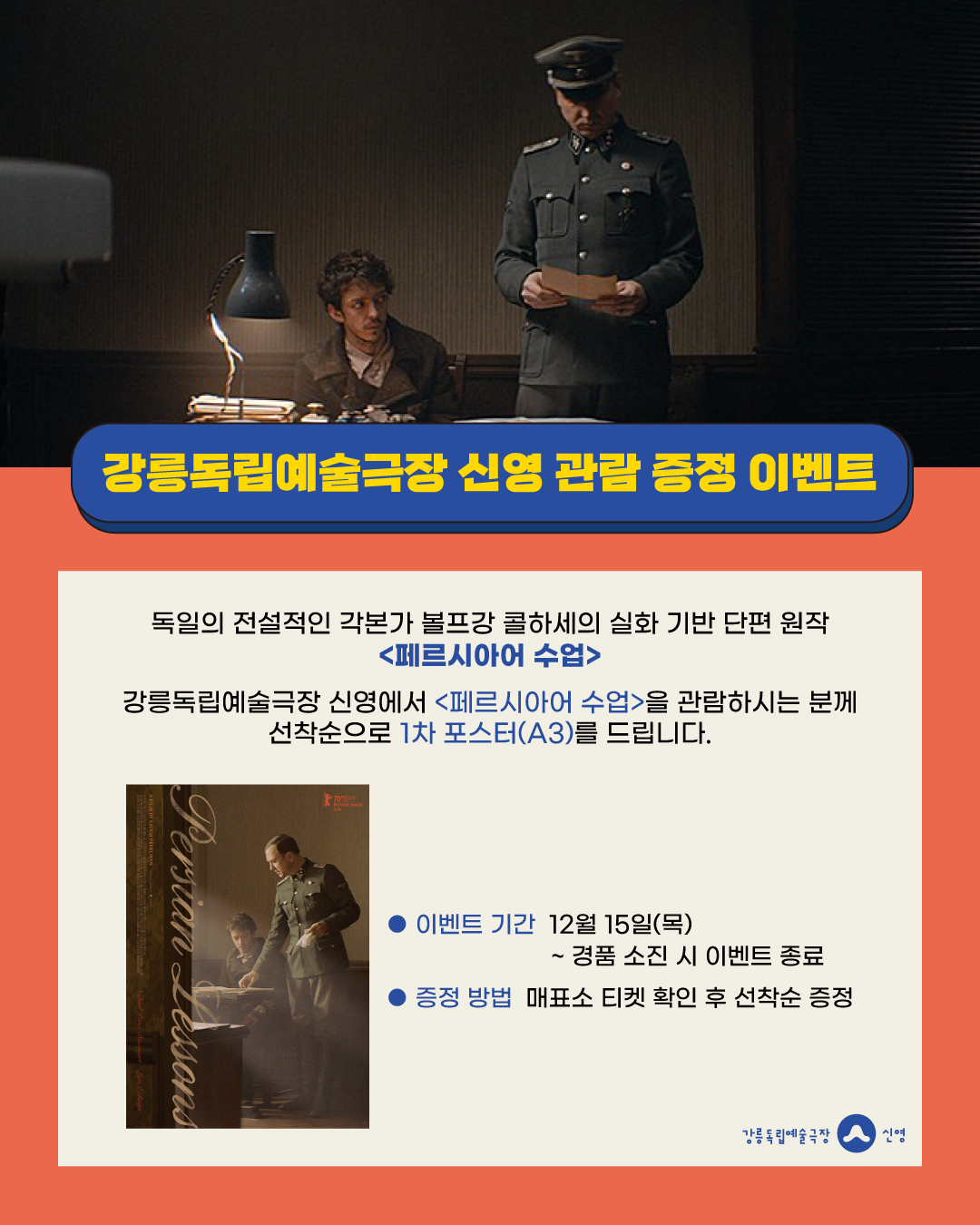 강릉독립예술극장 신영에서 <페르시아어 수업>을 관람하시는 분께 선착순으로 <페르시아어 수업> 포스터(A3)를 드립니다.
