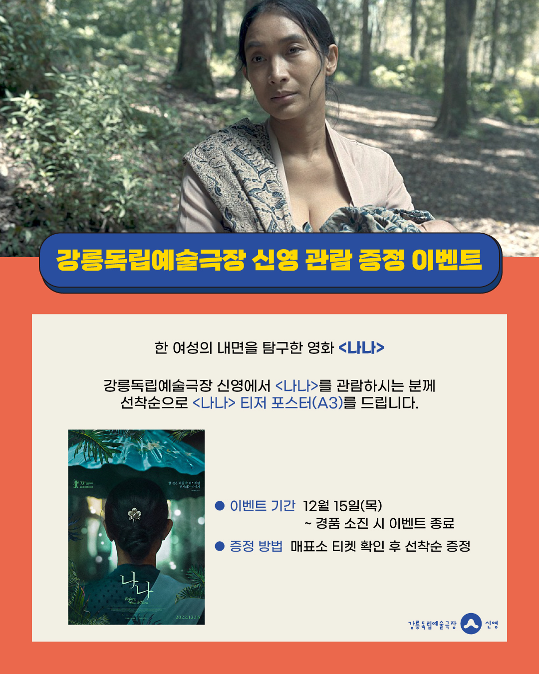 강릉독립예술극장 신영에서 <나나>를 관람하시는 분께 선착순으로 <나나> 티저 포스터(A3)를 드립니다.