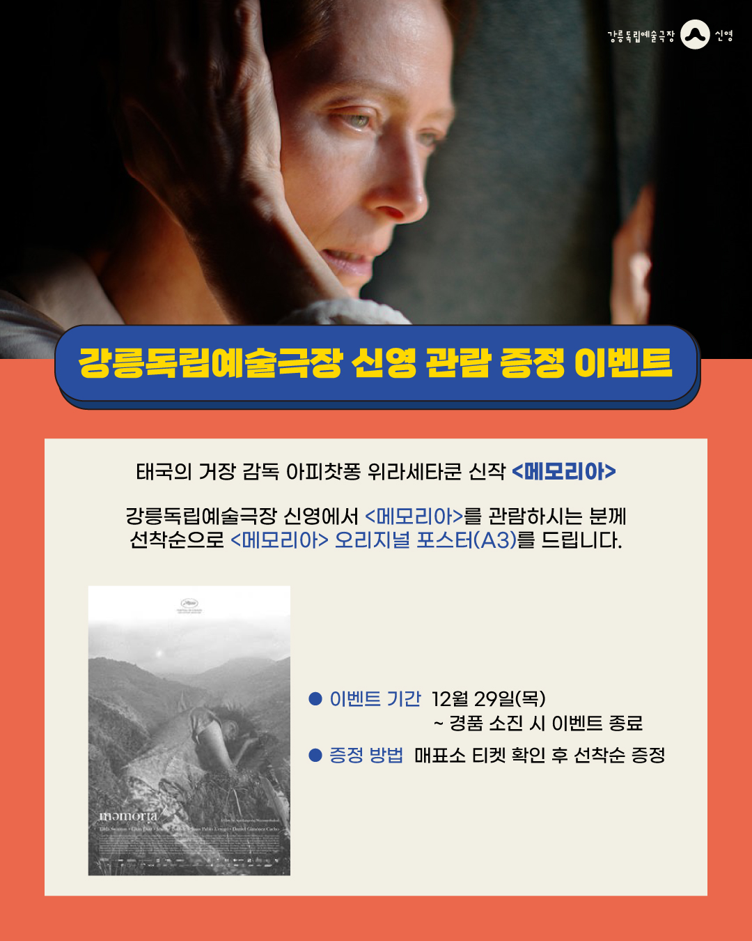 강릉독립예술극장 신영에서 <메모리아>를 관람하시는 분께 선착순으로 <메모리아> 오리지널 포스터(A3)를 드립니다.