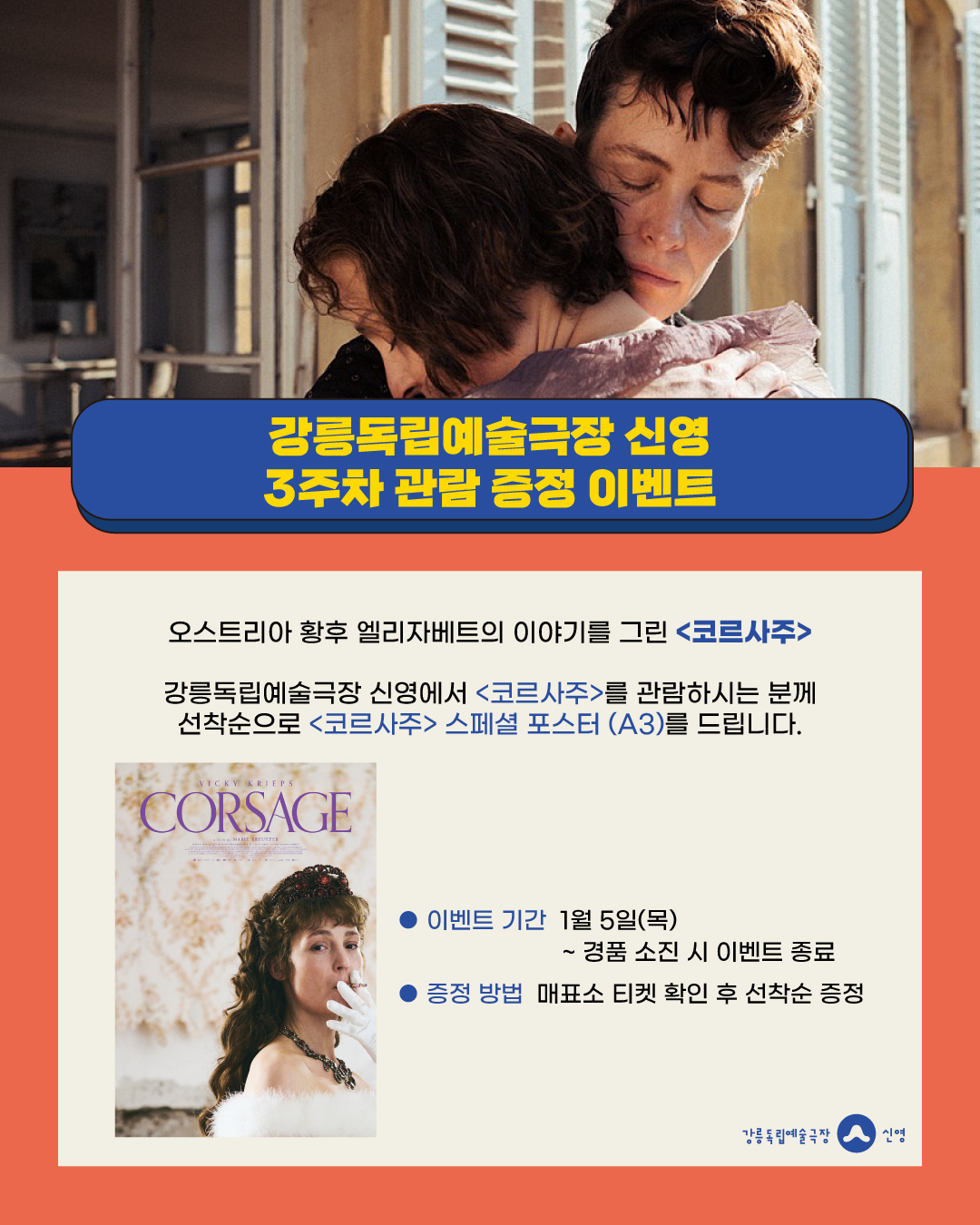 강릉독립예술극장 신영에서 <코르사주>를 관람하시는 분께 선착순으로 <코르사주> 스페셜 포스터(A3)를 드립니다.