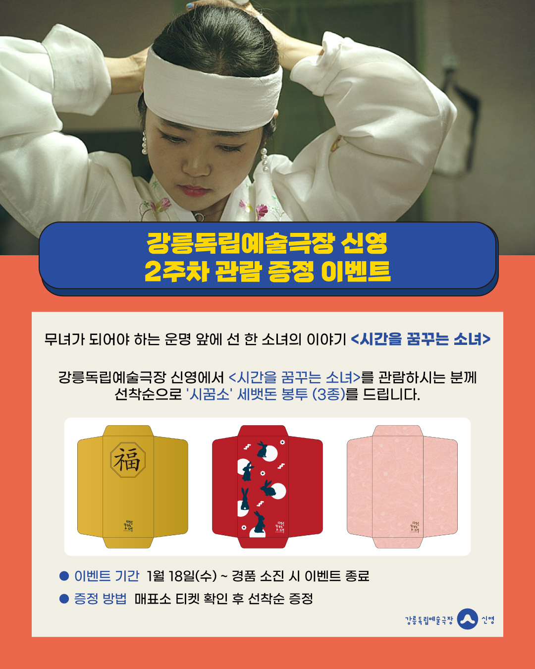 강릉독립예술극장 신영에서 <시간을 꿈꾸는 소녀>를 관람하시는 분께 선착순으로 '시꿈소' 세뱃돈 봉투(3종)를 드립니다.