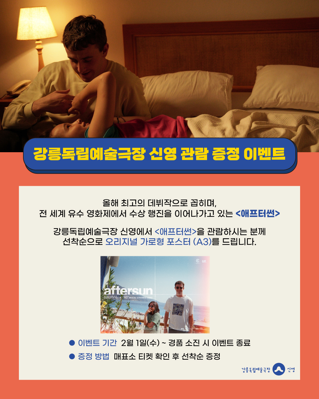 강릉독립예술극장 신영에서 <애프터 썬>을 관람하시는 분께 선착순으로 오리지널 가로형 포스터(A3)를 드립니다.