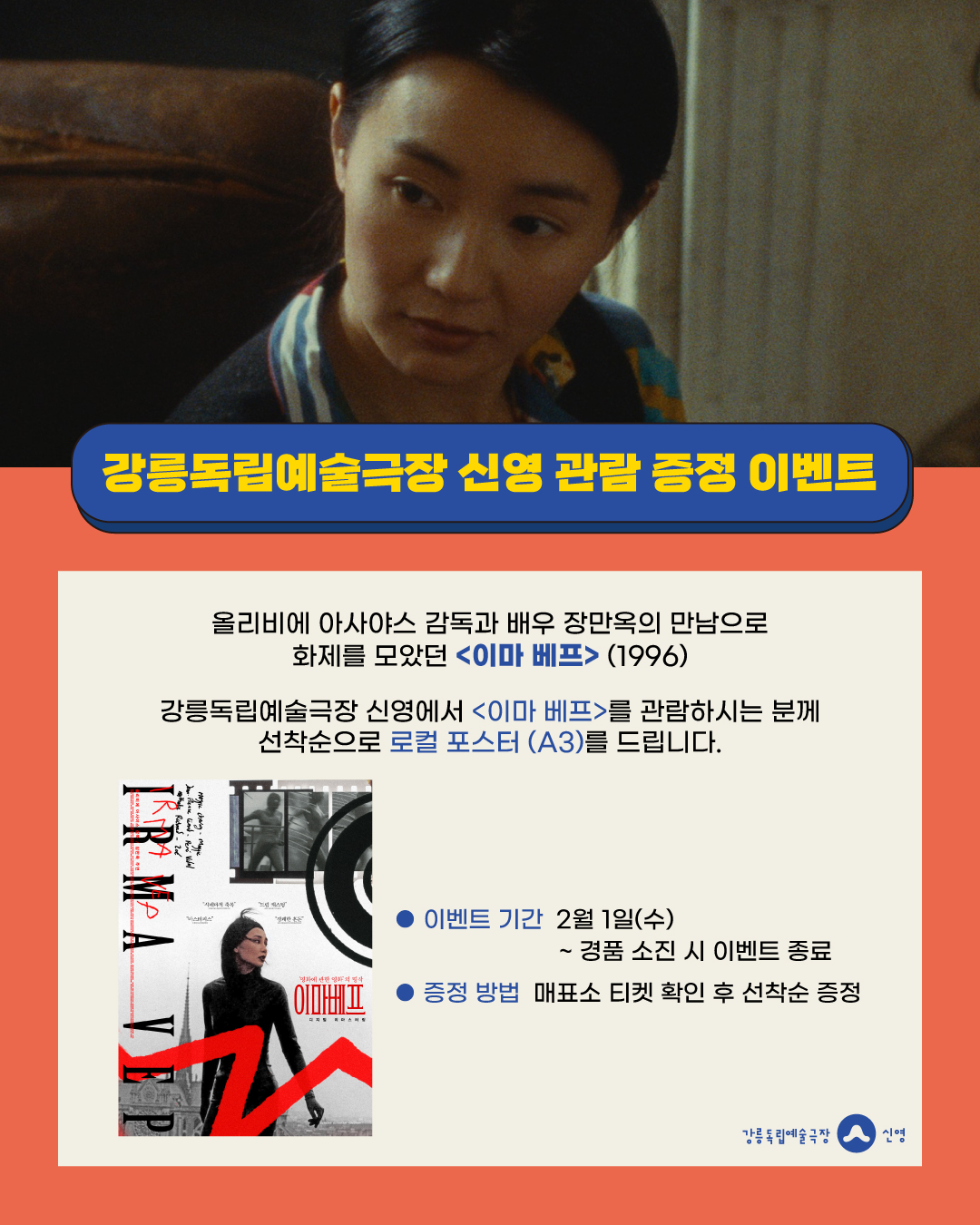 강릉독립예술극장 신영에서 <이마 베프>를 관람하시는 분께 선착순으로 로컬 포스터(A3)를 드립니다.