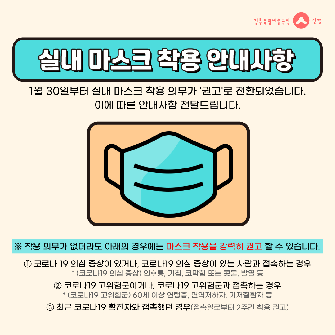 1월 30일부터 실내 마스크 착용 의무가 '권고'로 전환되었습니다. 이에 따른 안내사항 전달드립니다.