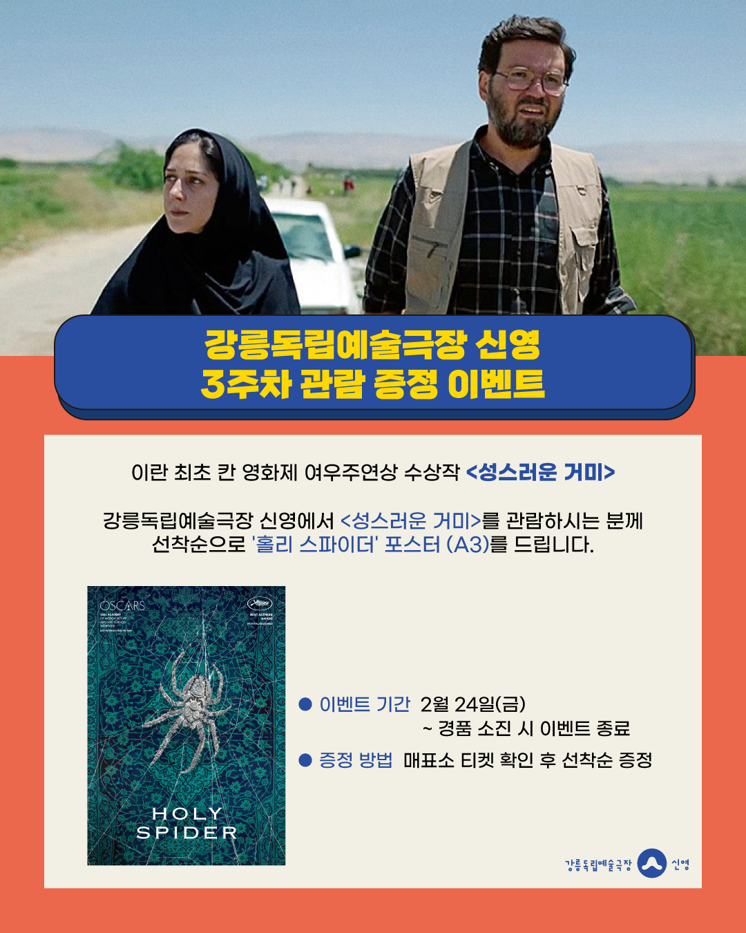 강릉독립예술극장 신영에서 <성스러운 거미>를 관람하시는 분께 선착순으로 <성스러운 거미> '홀리 스파이더' 포스터 (A3)를 드립니다.