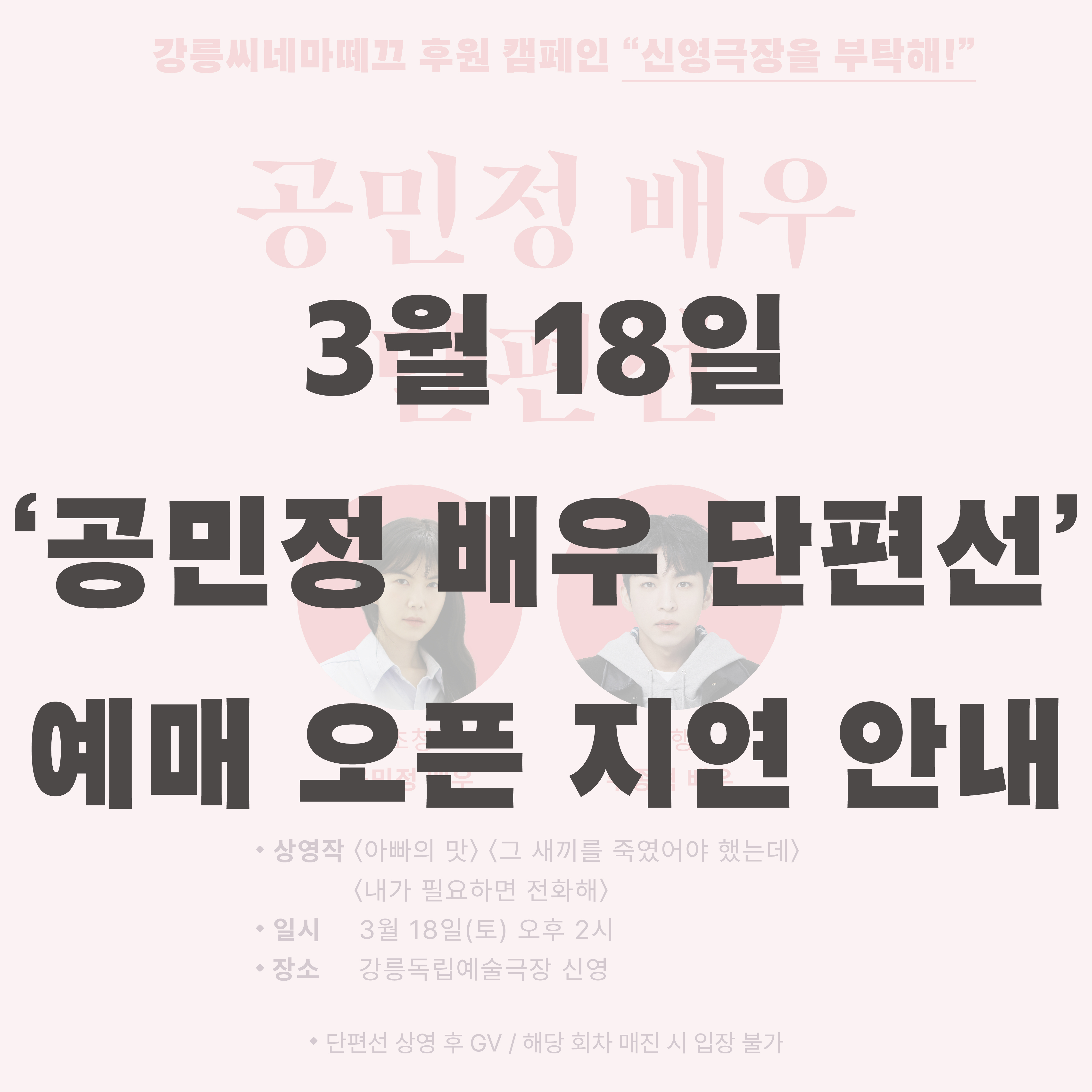 | [씨네토크] 공민정 배우 단편선 | 2023. 3. 18 (토) 오후 2시 (0) | 2023.03.10 |