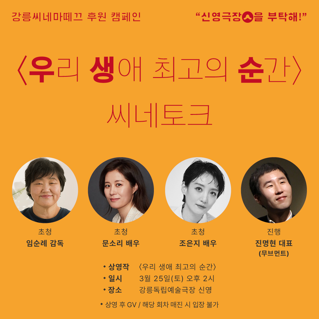 <우리 생애 최고의 순간> 개봉한 지 15주년이 되었습니다. 강릉씨네마떼끄 후원 캠페인으로 <우리 생애 최고의 순간>의 주역 임순례 감독과 문소리, 조은지 배우와 함께 영화 상영을 진행합니다. 많은 관심과 참여 부탁드려요.