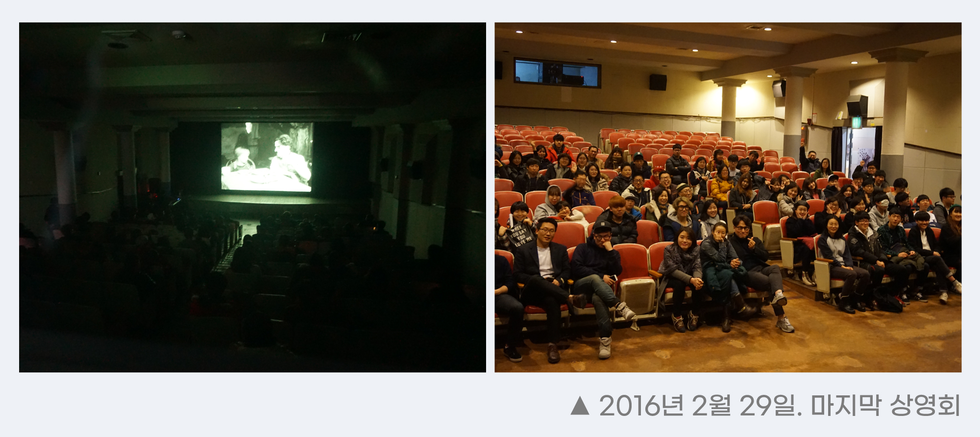 그렇게 2012년 첫해 6,000여 명, 2013년엔 9,000여 명, 2014년 1만 1천여 명의 관객이 신영극장에서 영화를 관람했고, 비율로 따지자면 연간 강릉 인구의 1/20이나 되는 관객들이 신영을 방문하게 되었습니다. 하지만 신영극장이 문을 여는 데 가장 중요한 역할을 했던 영화진흥위원회의 예술영화전용관 운영지원사업이 2015년에 중단되고, ‘예술영화 유통·배급 지원사업’으로 전환되면서 큰 위기를 맞이하게 됩니다. 예술영화전용관 운영지원사업은 공모를 통해 선정된 전국의 예술영화전용관에 운영비를 지원하는 사업이었다면, 예술영화 유통·배급 지원사업은 위탁 수행자를 통해 한국 예술영화 24편을 선정하고 극장이 선정된 영화를 일정 회차 상영하여 대관비를 확보하는 식이었습니다. 강릉씨네마떼끄는 이러한 지원 형태가 극장 고유의 프로그래밍 자유를 국가에서 침해하는 것이라 판단했고, 지원사업에 불참하는 것으로 해당 사업을 보이콧했습니다. 1년간은 자체 자금으로 어떻게든 버텼으나 결국 재정난으로 인해 2016년 2월 29일을 마지막으로 문을 닫았습니다.