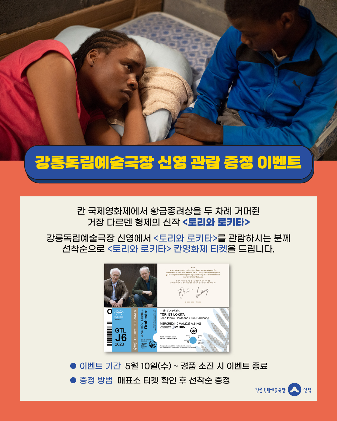 강릉독립예술극장 신영에서 <토리와 로키타>를 관람하시는 분께 선착순으로 <토리와 로키타> 칸영화제 티켓을 드립니다.