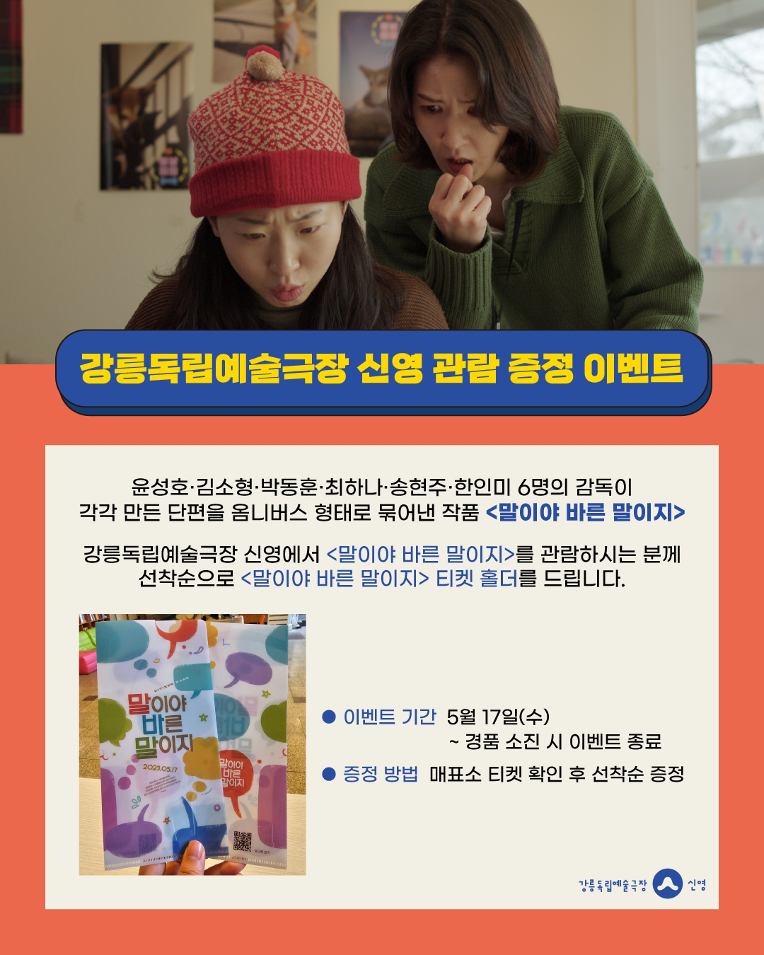 강릉독립예술극장 신영에서 <말이야 바른 말이지>를 관람하시는 분께 선착순으로 <말이야 바른 말이지> 티켓 홀더를 드립니다.