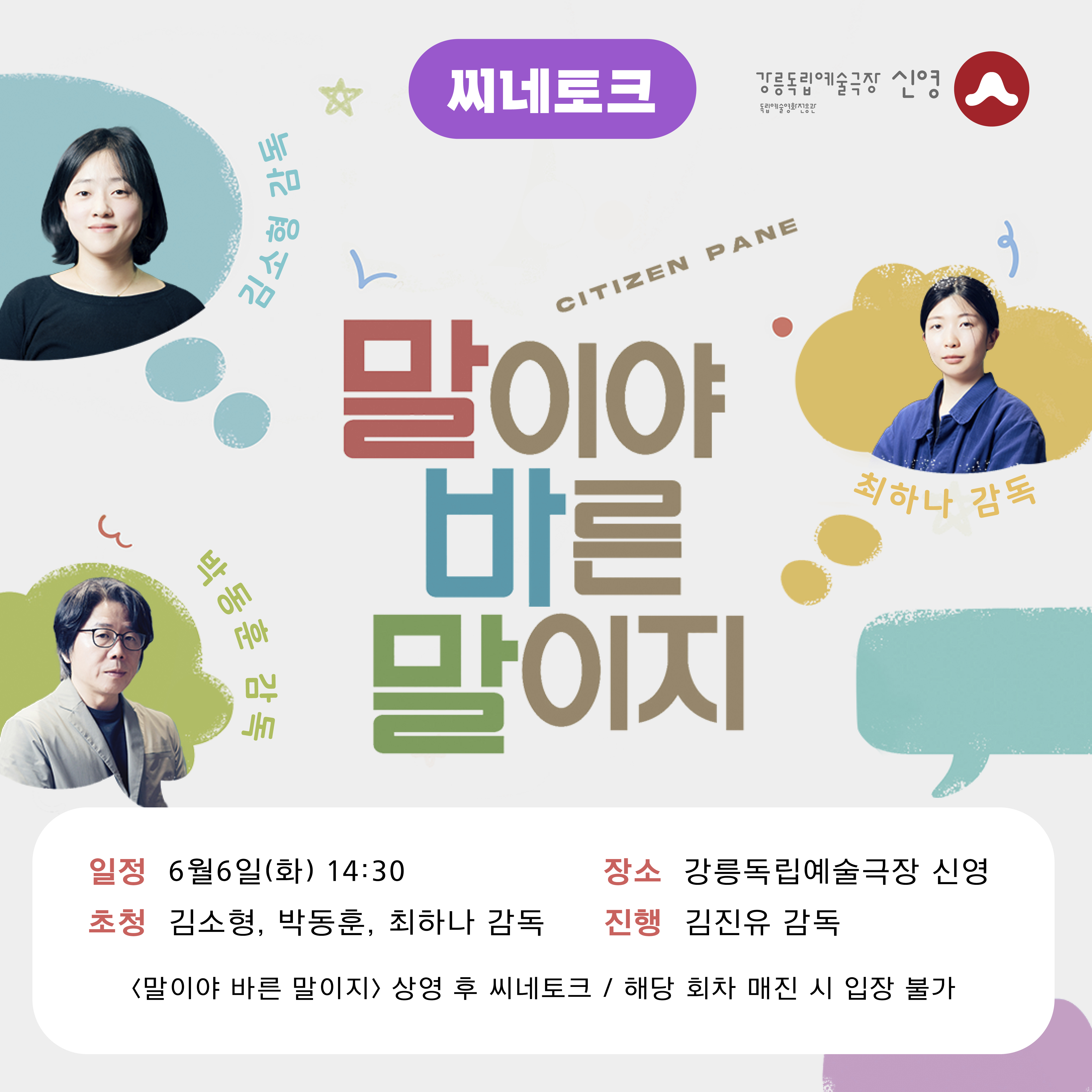 영화 상영 후 <말이야 바른 말이지>의 김소형(<하리보> 연출), 박동훈(<당신이 사는 곳이 당신이 누구인지 말해줍니다?> 연출), 최하나(<진정성 실천편> 연출) 감독과 함께 영화에 관한 이야기를 나눠보는 시간을 갖습니다. 많은 관심과 참여 바랍니다.