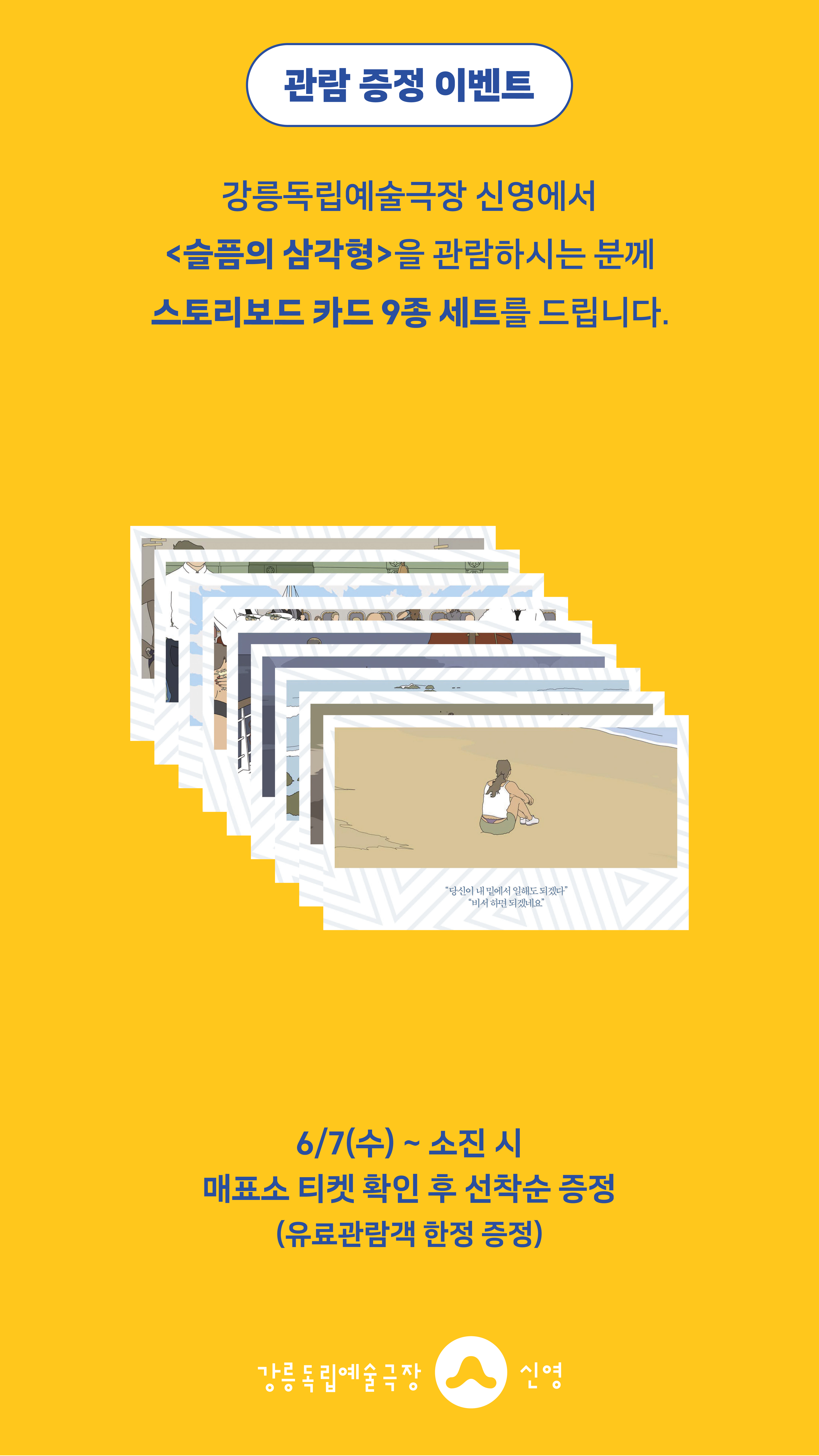 강릉독립예술극장 신영에서 <슬픔의 삼각형>을 관람하시는 분께 선착순으로 스토리보드 카드 9종 세트를 드립니다.