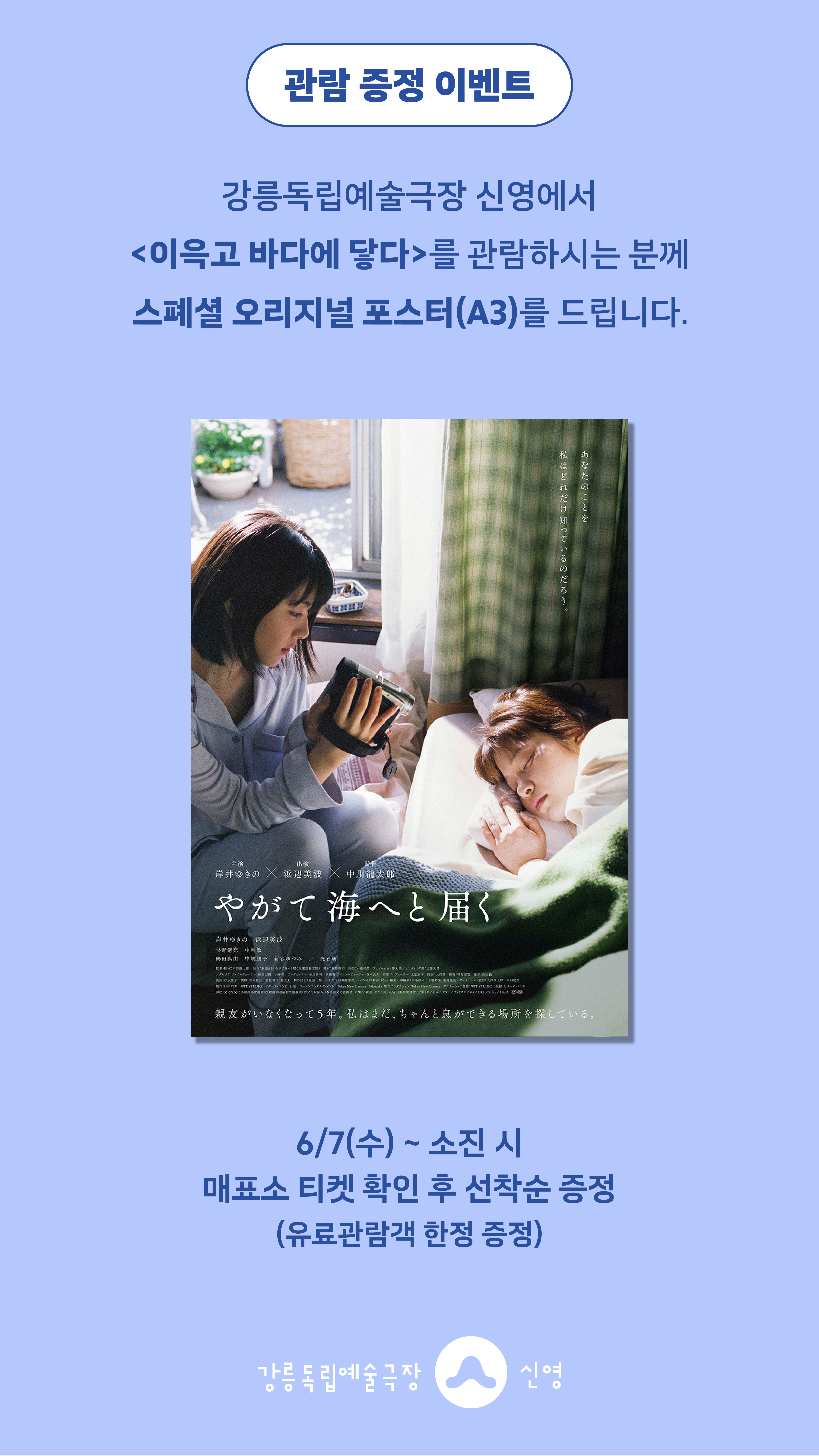 강릉독립예술극장 신영에서 <이윽고 바다에 닿다>를 관람하시는 분께 선착순으로 스폐셜오리지널 포스터(A3)를 드립니다.