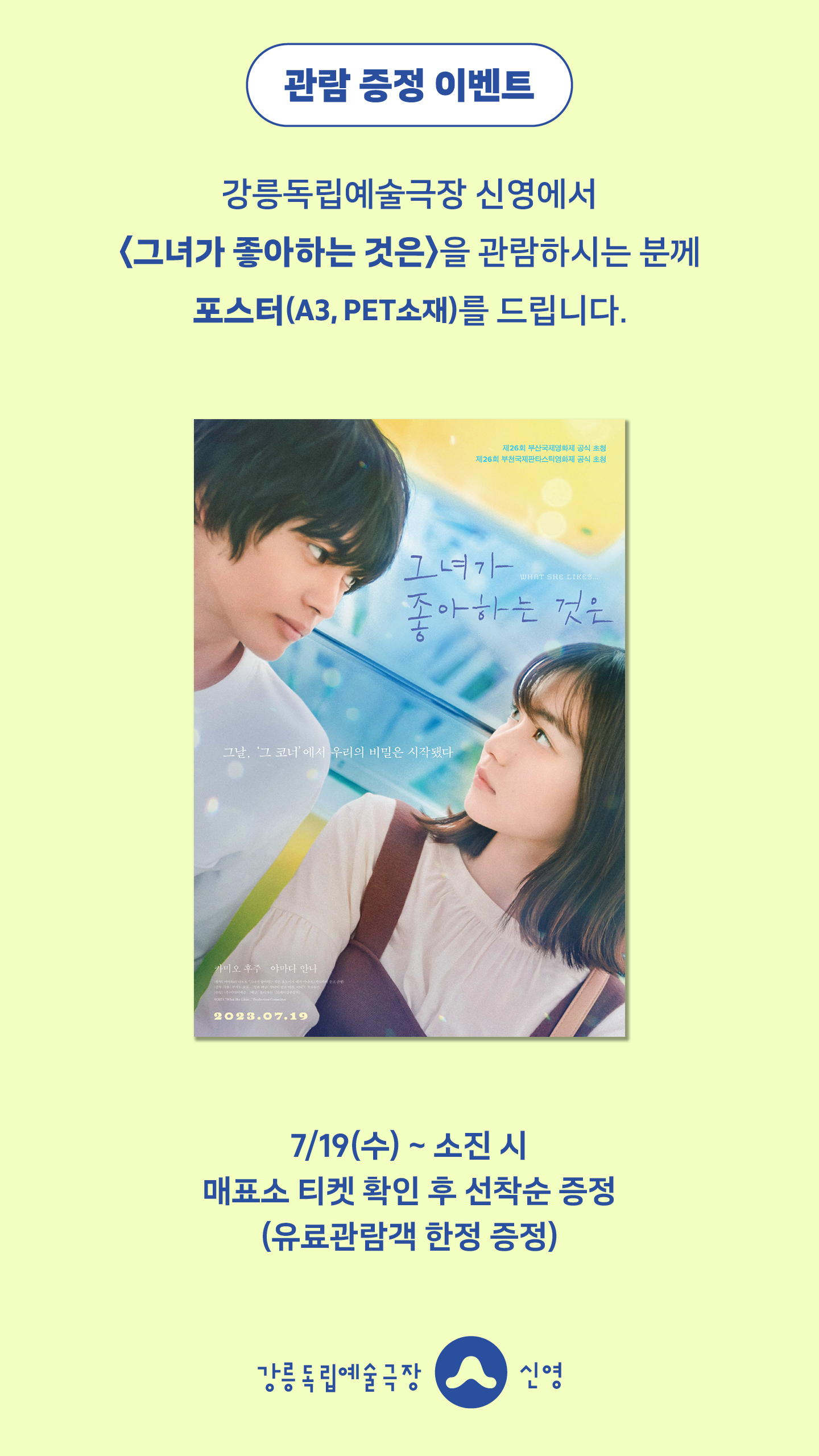 강릉독립예술극장 신영에서 <그녀가 좋아하는 것은>을 관람하시는 분께 선착순으로 포스터(A3, PET소재)를 드립니다.