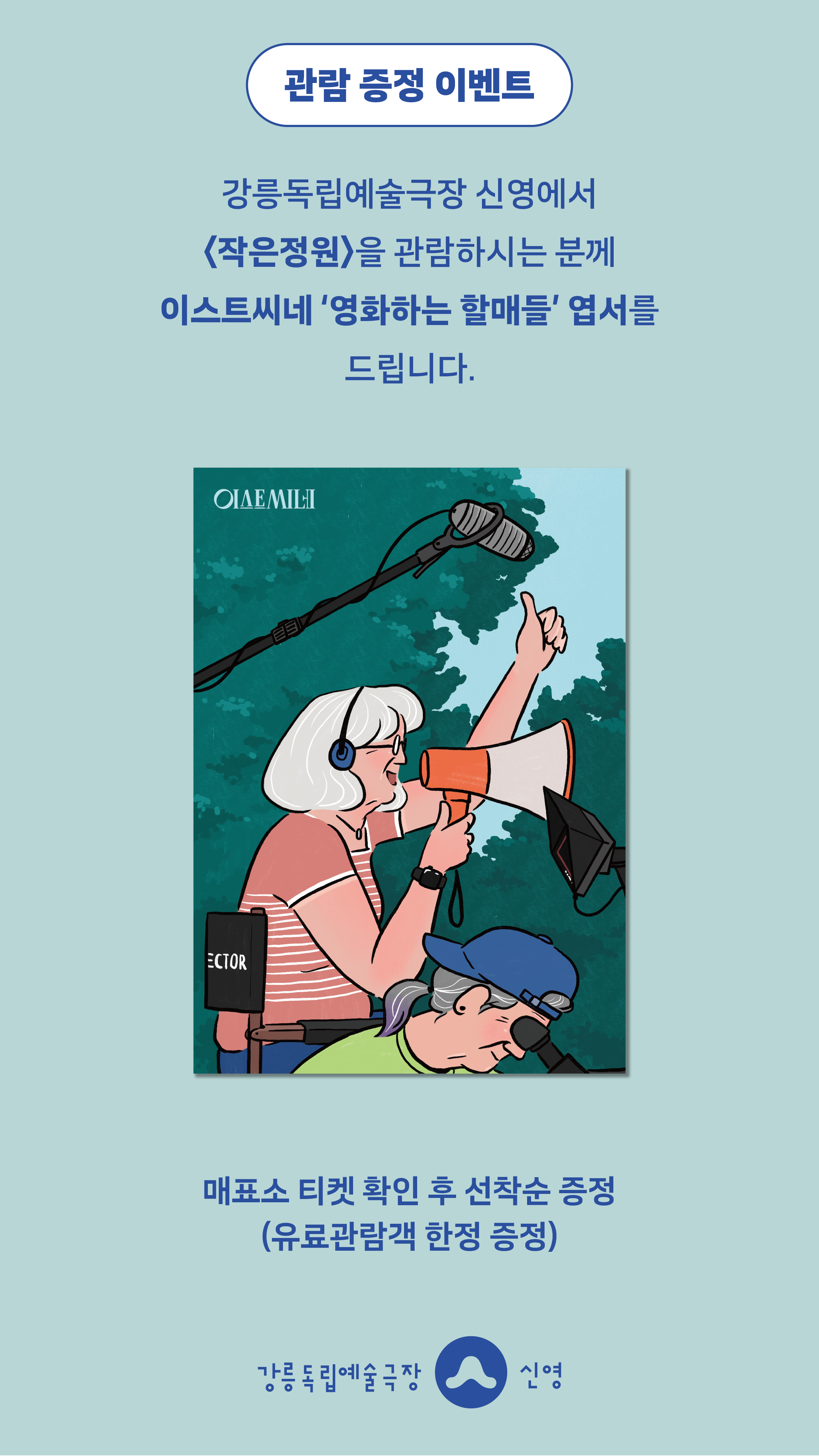 강릉독립예술극장 신영에서 <작은정원>를 관람하시는 분께 선착순으로 이스트씨네 '영화하는 할매들' 엽서를 드립니다.