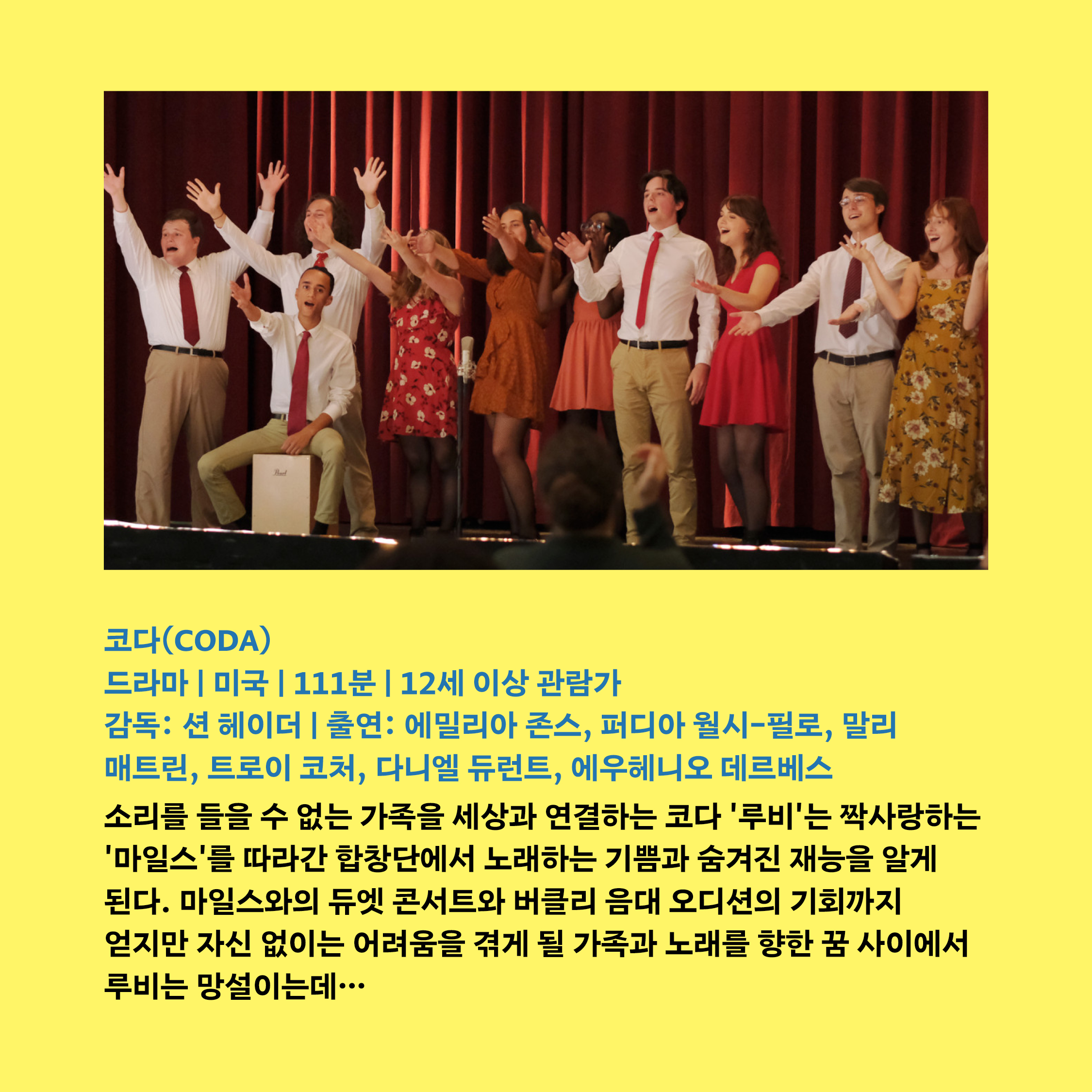 #코다 #션헤이더 #에밀리아존스 #퍼디아월시필로 #에우헤니오데르베스 #말리매트린 #트로이코처 #다니엘듀런트 #제94회아카데미상작품상 #제94회아카데미상각색상 #2021선댄스영화제미국극영화부문관객상 #심사위원특별대상 ##배리어프리영화 #배리어프리 #모두가함께보는영화