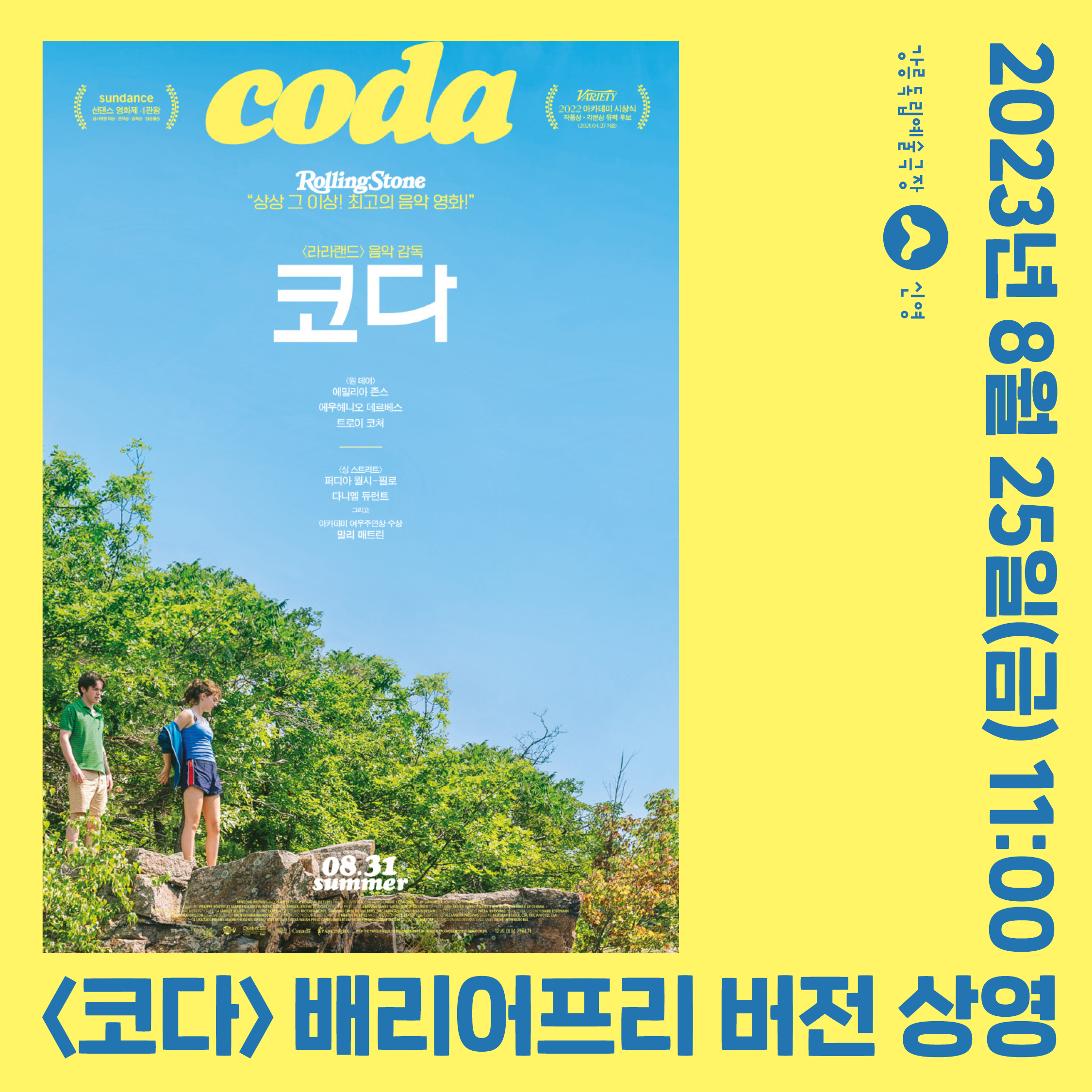 강릉독립예술극장 신영에서는 월 1회 배리어프리 영화를 상영합니다. 8월의 배리어프리 영화는 〈코다〉입니다. 소리를 들을 수 없는 가족을 세상과 연결하는 코다 '루비'가 어느 여름날, 우연히 노래와 사랑에 빠지면서 꿈을 향해 달리는 감동 가득한 뮤직 드라마 〈코다〉를 신영에서 다시 만나보세요.