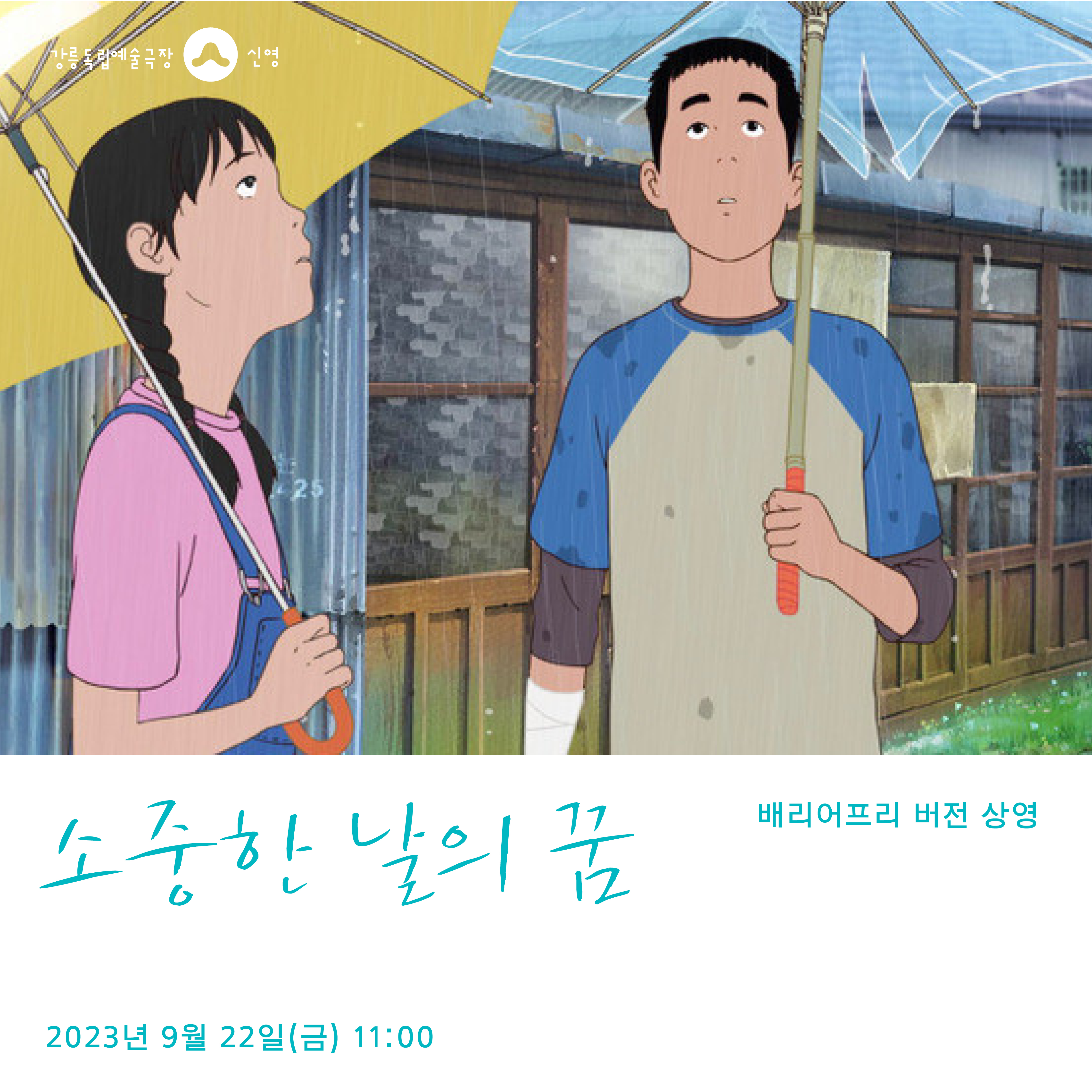 강릉독립예술극장 신영에서는 월 1회 배리어프리 영화를 상영합니다. 9월의 배리어프리 영화는 ⟨소중한 날의 꿈⟩입니다. 사춘기 소녀 '이랑'의 꿈과 사랑을 그린 애니메이션입니다. 풋풋 했던 시절의 꿈과 사랑을, 10만장의 손그림으로 감성있게 담아낸 ⟨소중한 날의 꿈⟩을 신영에서 다시 만나보세요.