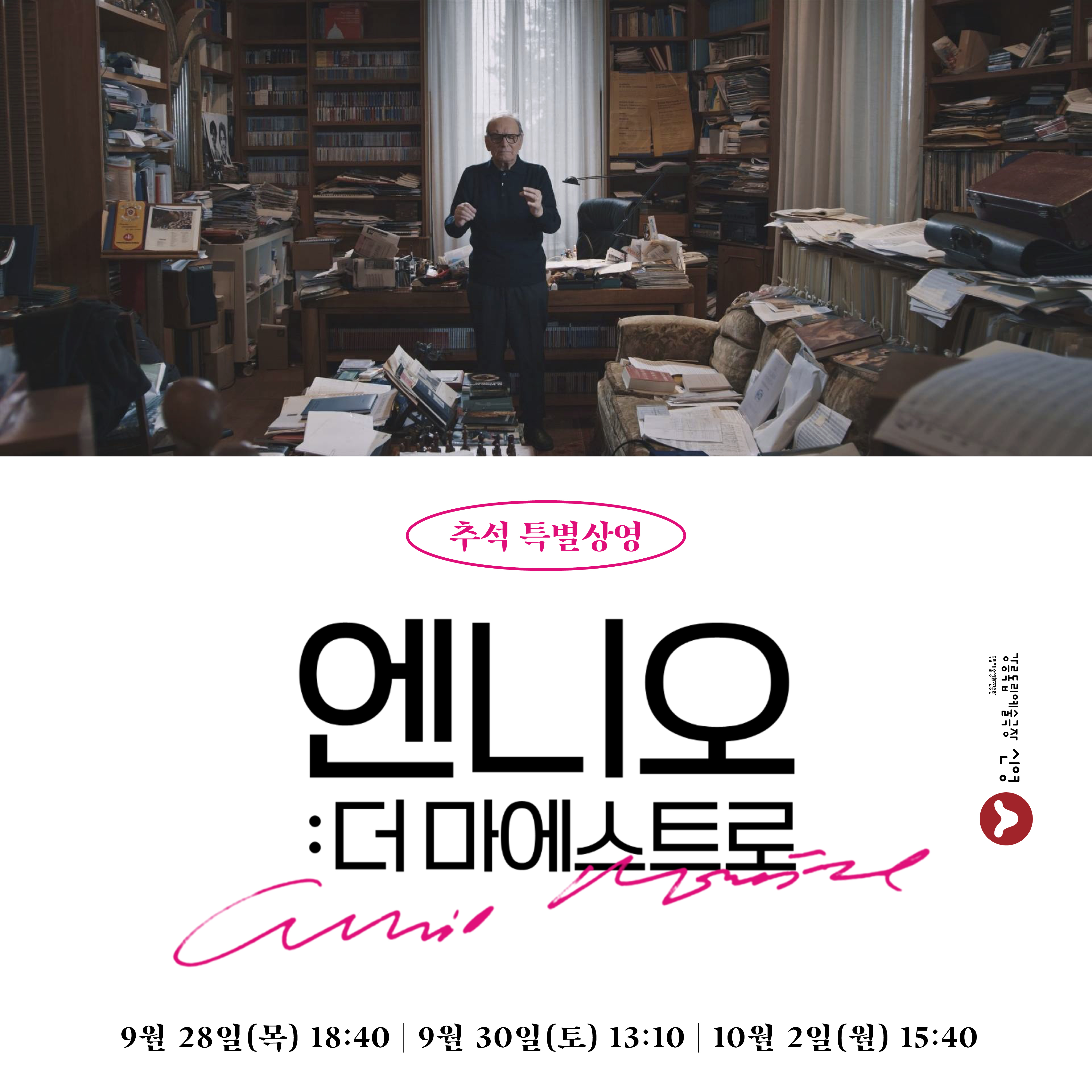 지난 7월 개봉하여, 많은 관객에게 사랑 받으며 종영후에도 상영 문의가 많았던 <엔니오: 더 마에스트로>🎶를 추석을 맞아 특별 상영합니다. 추석 연휴 기간 동안, 사랑하는 가족·친구들과 엔니오 모리꼬네의 삶과 음악을 감상하며 즐거운 시간을 보내세요. 많은 관심 부탁드립니다.