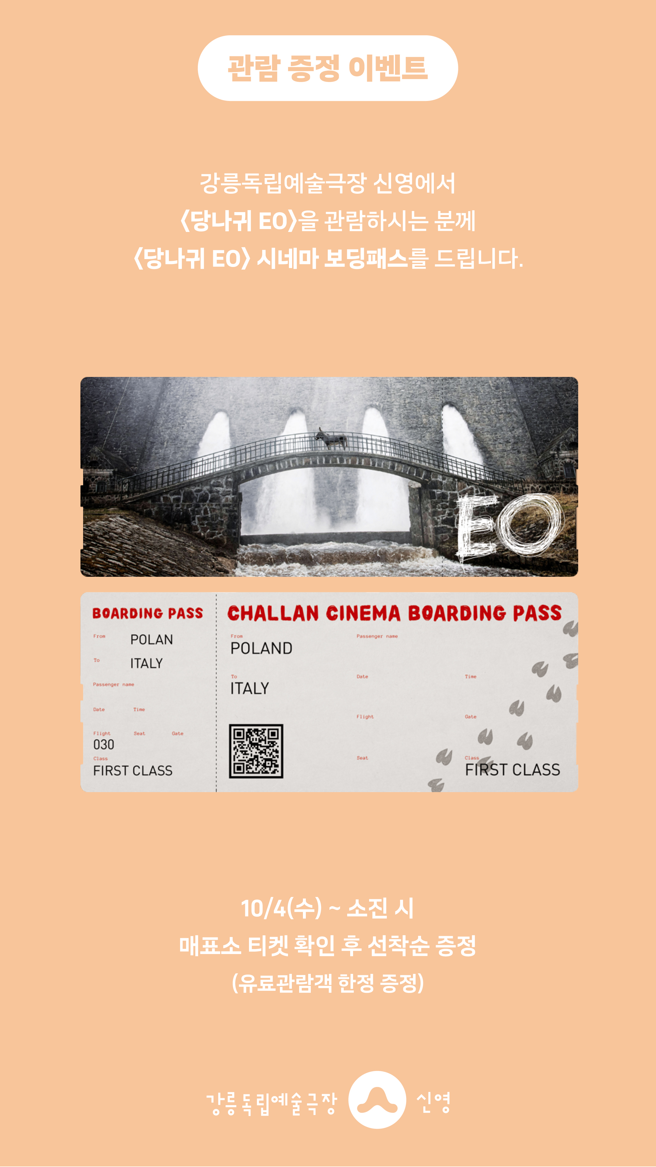 강릉독립예술극장 신영에서 <당나귀 EO>를 관람하시는 분께 선착순으로 <당나귀 EO> 시네마 보딩패스를 드립니다.