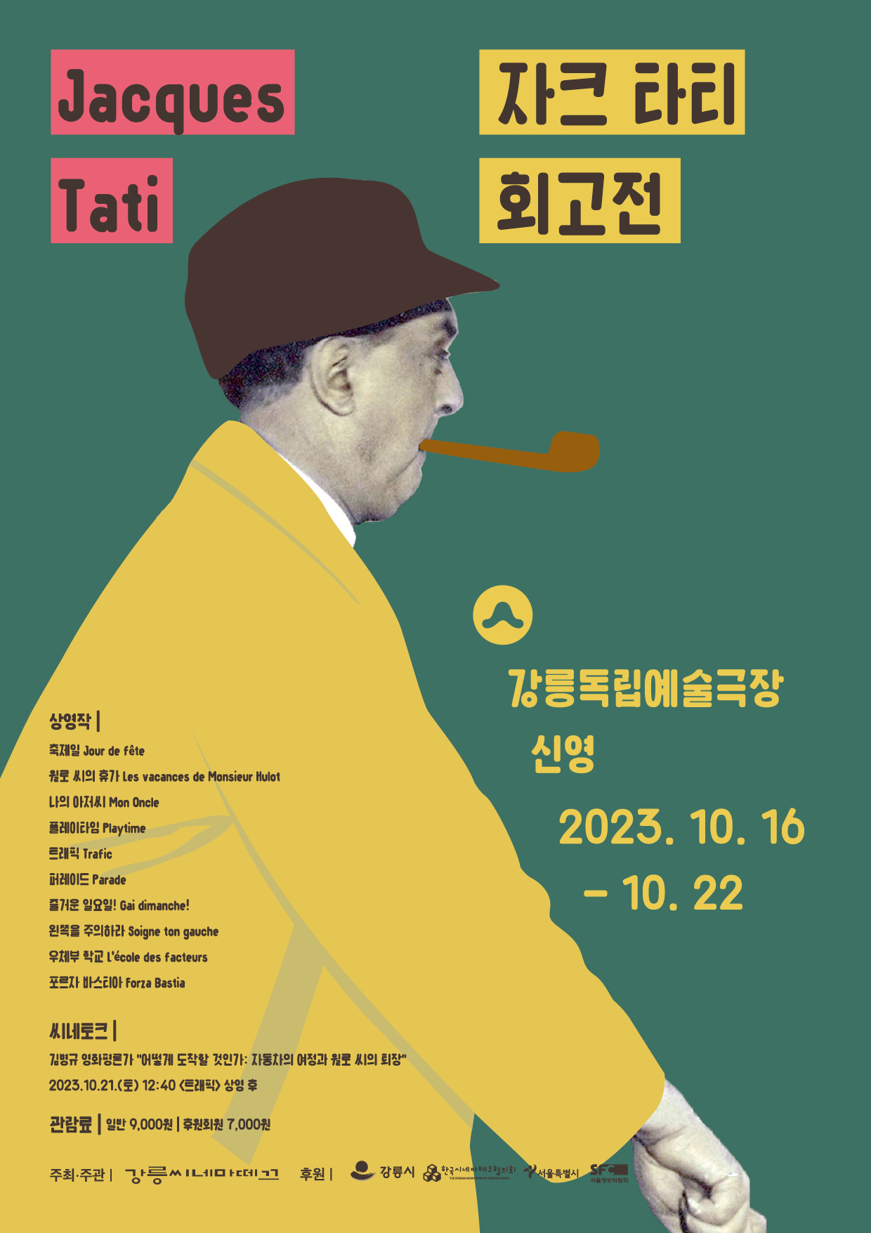 자크 타티(Jacques Tati, 1907~1982)는 프랑스를 대표하는 영화감독 중 한 명입니다. 평생 6편의 장편영화와 2편의 단편영화를 연출했으며, 직접 ‘윌로 씨’라는 캐릭터로 등장해 모험을 펼칩니다. 중절모를 쓰고, 파이프 담배를 입에 물고, 트렌치코트를 입은 채 언제 사용할지 모르는 우산을 꼭 챙겨 다니는 윌로 씨의 세계에는 자크 타티가 보여주고 싶은 작은 혼란과 질서가 있습니다. 프랑스의 시골 마을, 바닷가 휴양지, 대도시의 한복판 등 영화의 주요한 배경마다 펼쳐지는 크고 작은 소동에는 언제나 따뜻한 기운과 웃음이 함께할 것입니다. 더불어 자크 타티의 영화 세계를 더욱 풍성하게 전해줄 김병규 영화평론가의 강연도 준비되어 있으니 많은 참여 바랍니다.