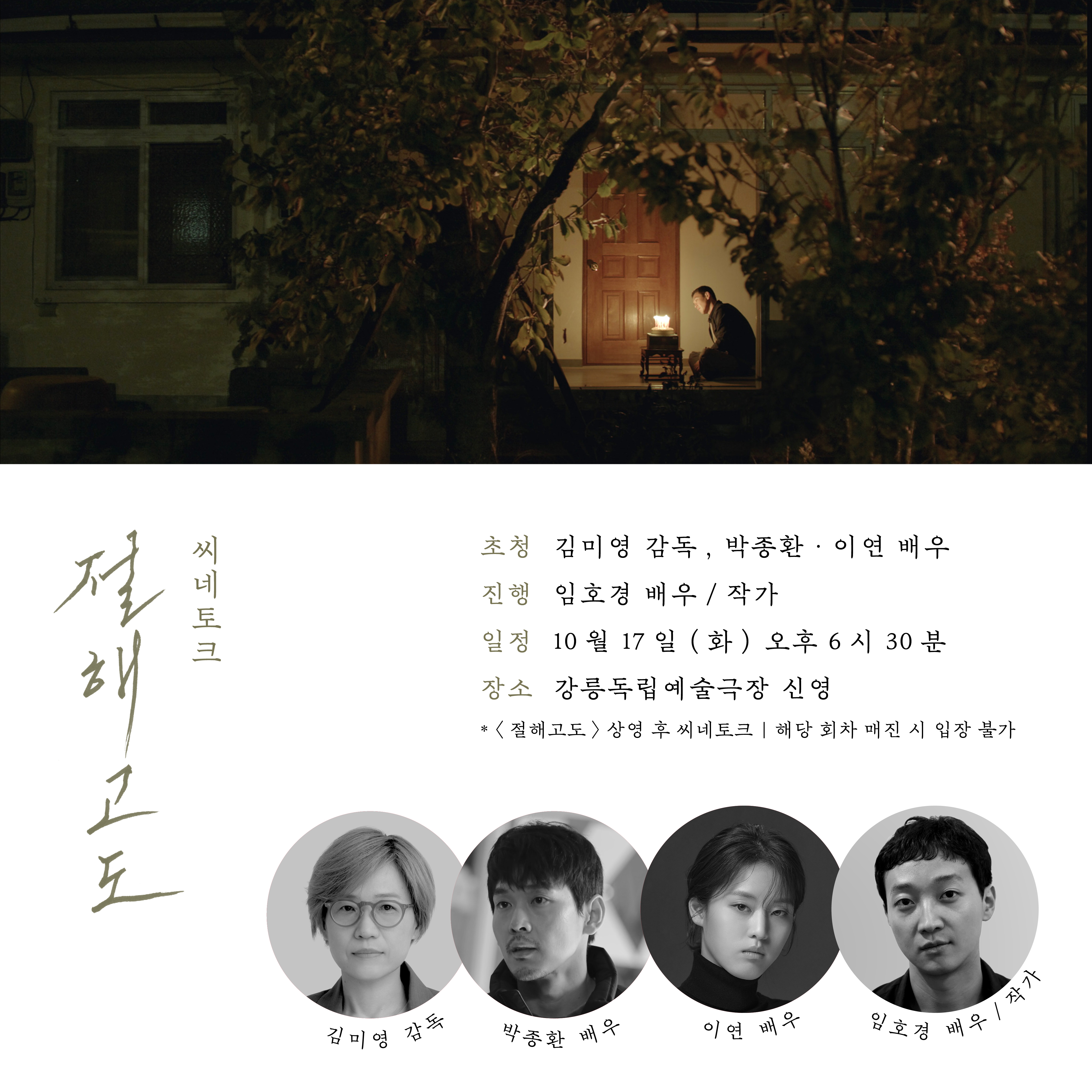 영화 상영 후 <절해고도>를 연출한 김미영 감독, 윤철 역을 연기한 박종환 배우, 지나 역을 이연 배우와 함께 영화에 관한 이야기를 나눠보는 시간을 갖습니다.